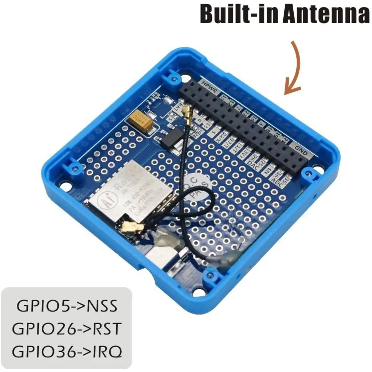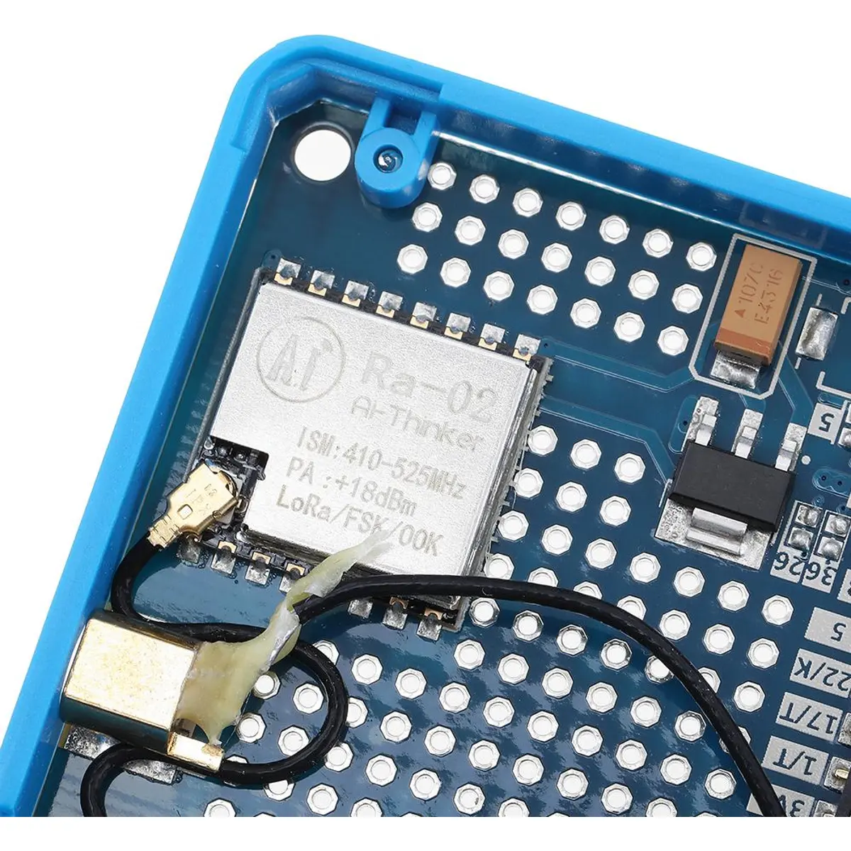 Módulo LoRa Ra-02, desenhado e produzido por Ai-Thinker. Na placa, resta algum espaço extra; assim tem uma área de prototipagem, o que é ótimo para adicionar ao seu circuito personalizado trabalhando com o módulo LoRa.