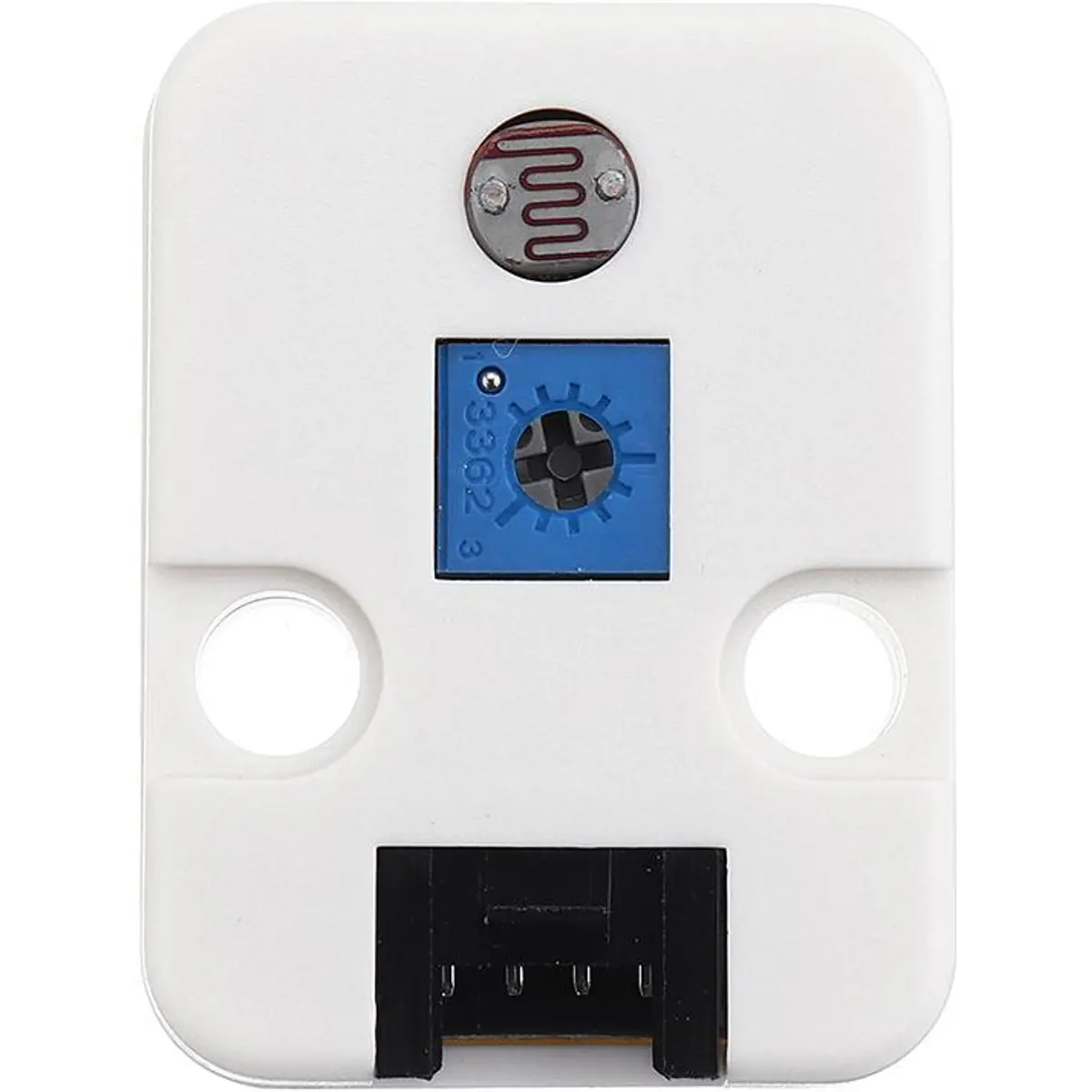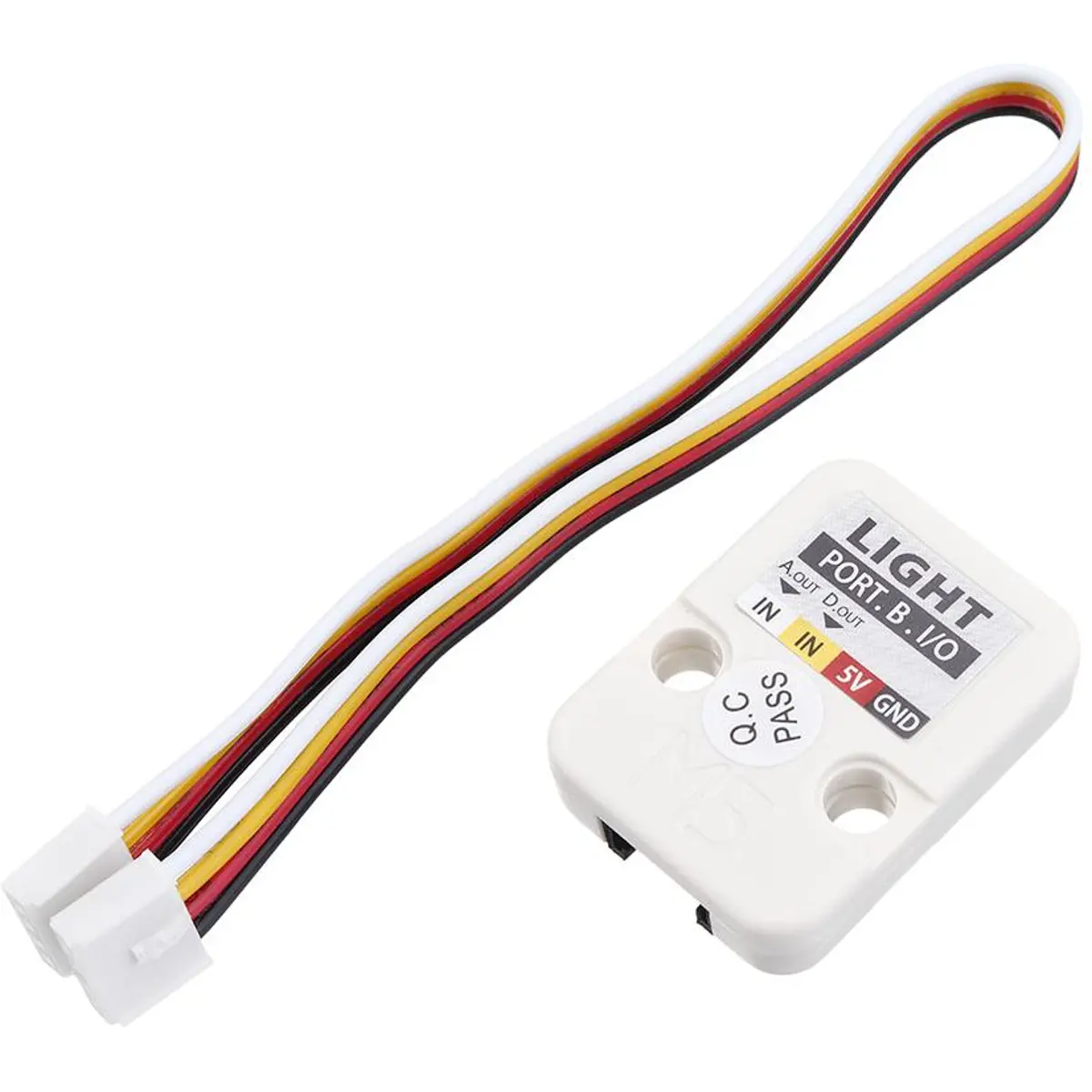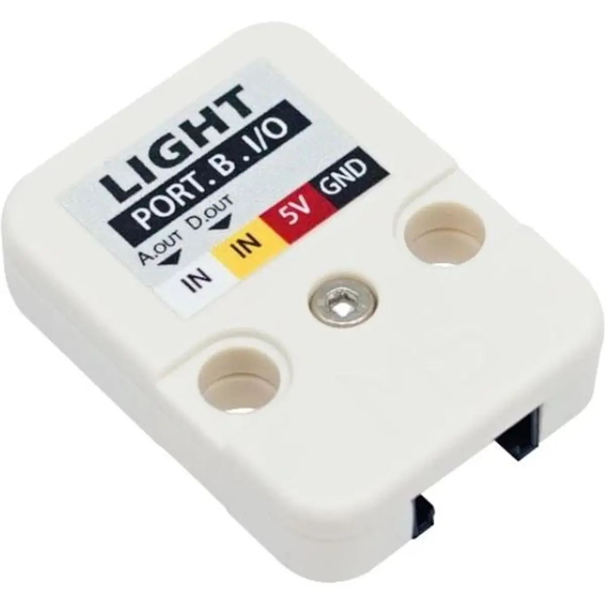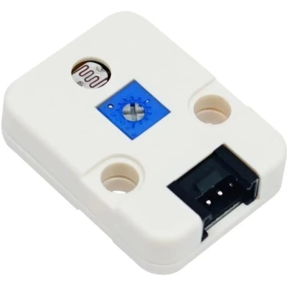 Sensor de intensidade de luz com fotorresistor ajustável por potenciômetro de 10K. A resistência do fotorresistor varia conforme a luminosidade, permitindo detetar as mudanças através da fotocondutividade e usar um AD para converter as variações em dados digitais. Compatível com plataformas de software UIFlow, Blocky e Python, bem como com ambientes Arduino, facilitando projetos educativos e de prototipagem. Possui dois furos compatíveis com Lego para montagem simples em protótipos.