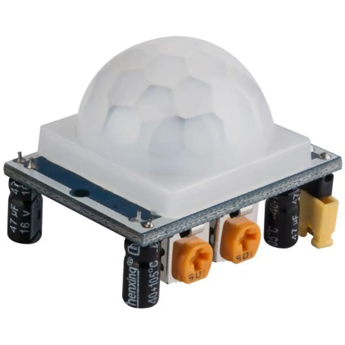 Sensor de movimento PIR para deteção de movimentos humanos em interior ou exterior. Opera com alimentação entre 4.5 e 20V DC e ligação de três pinos (GND, VCC e OUT). Ajusta-se a sensibilidade e o tempo via potenciômetros; tempo de espera de 0.3-18s. Saída: alto 3V, baixo 0V. Alcance de deteção até 7 metros com ângulo de deteção de 120 graus. Faixa de funcionamento entre -15°C e 70°C e dimensões de 32x24x25 mm.