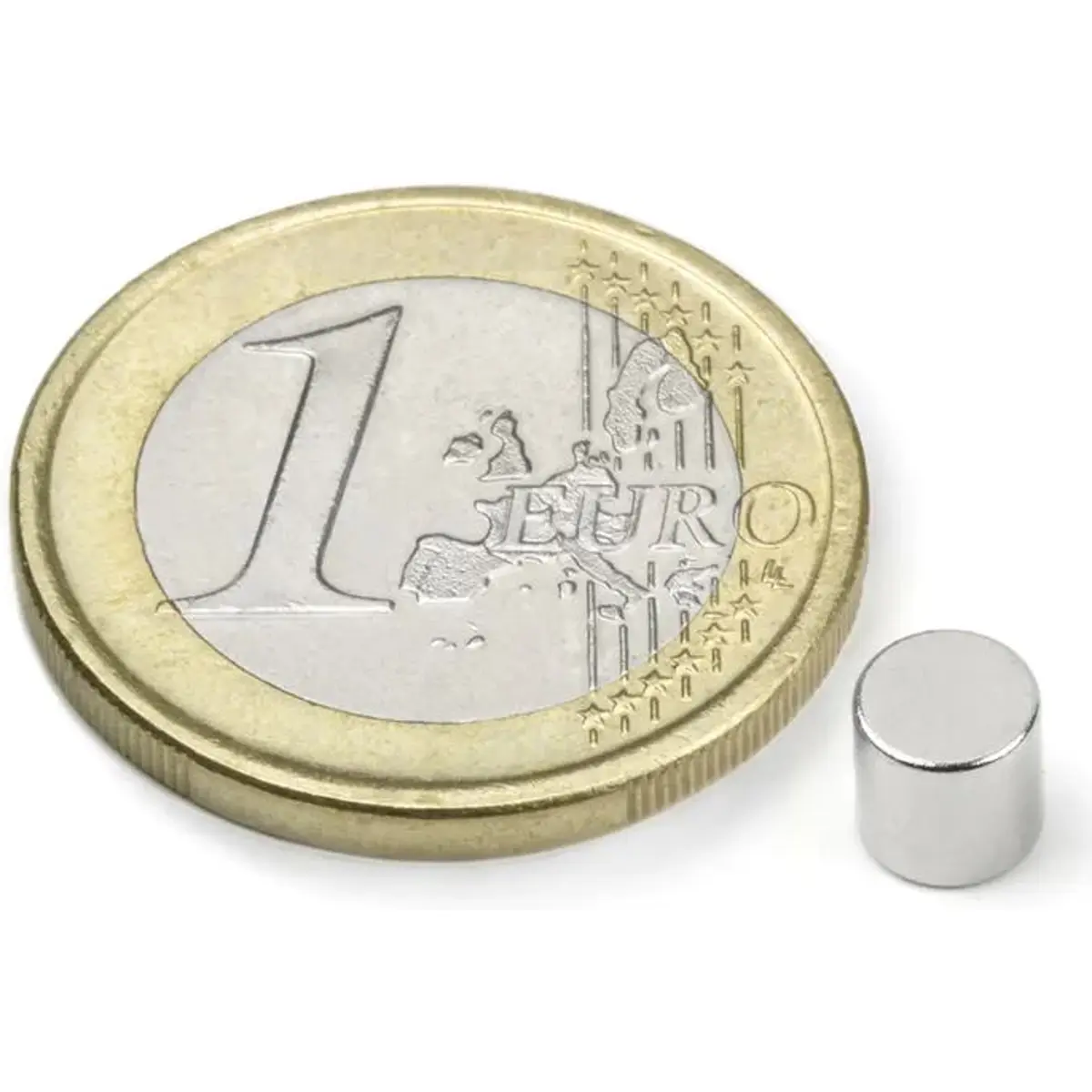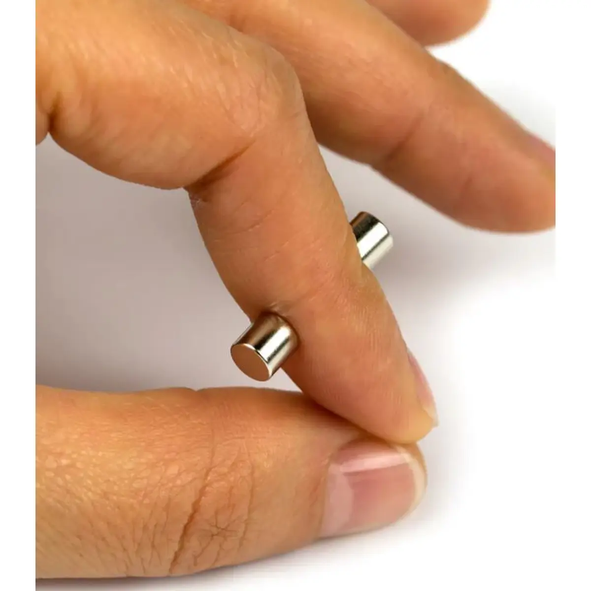 Íman cilíndrico de neodímio NdFeB com revestimento Ni-Cu-Ni, diâmetro 5 mm e altura 5 mm, tolerância de ±0,1 mm e magnetização axial. Possui magnetização N45 e força de retenção de aproximadamente 940 g (~9,22 N). Pesa cerca de 0,75 g e suporta até 80°C de temperatura de trabalho. Ideal para montagens de precisão, fixação rápida e aplicações que exigem alta densidade de fluxo magnético, com dimensões pequenas e desempenho estável.