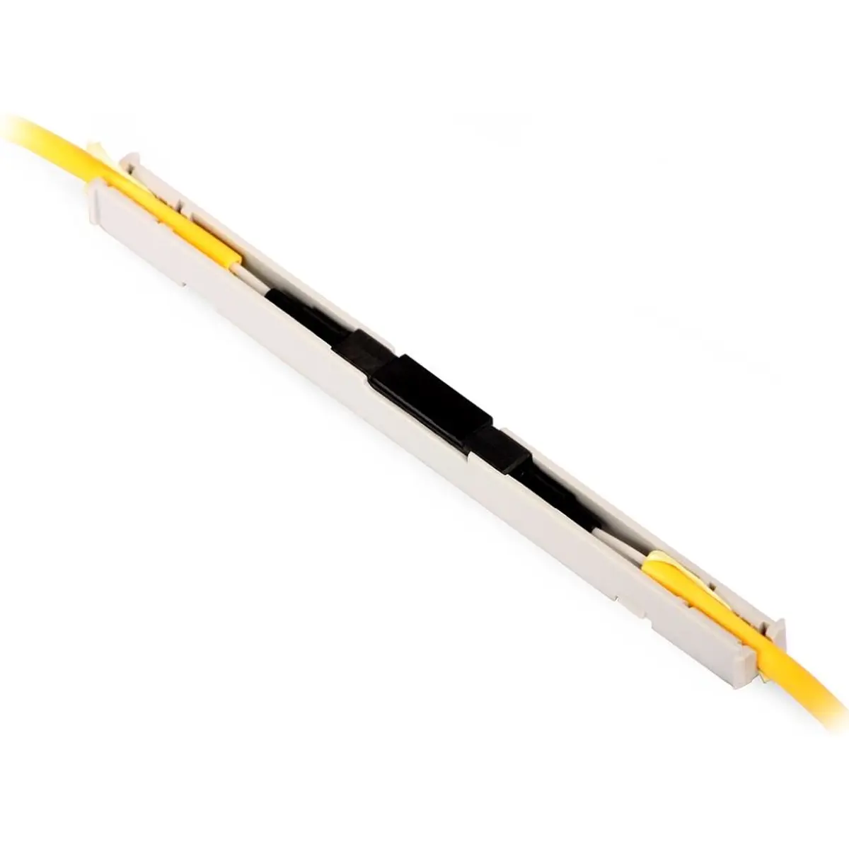 Protetor de emenda mecânica para fibra óptica, com 91 mm de comprimento e cor branca, compatível com cabos de fibra até 3 mm de diâmetro. Ideal para montagem em repartidores e caixas de distribuição de difícil acesso, oferecendo proteção física à emenda, dimensões compactas de 91 x 7 x 8 mm e instalação simples, sem necessidade de ferramentas especiais.