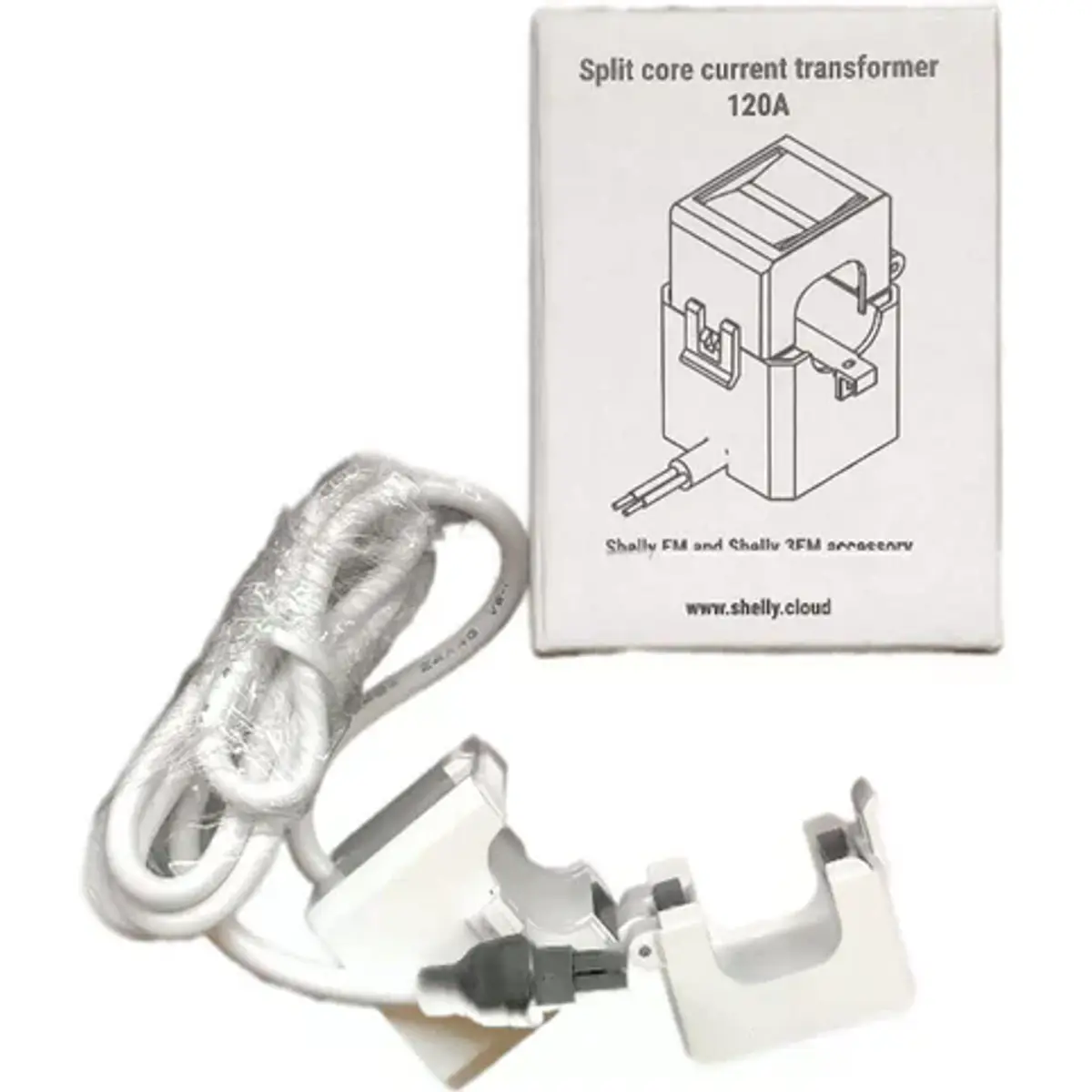 Transformador de intensidade de corrente (TI ou TC) com núcleo de ferrite abrível (dividido), para medição de elevadas correntes AC (até 120A). Concebido para módulos Shelly específicos para medição de consumos.