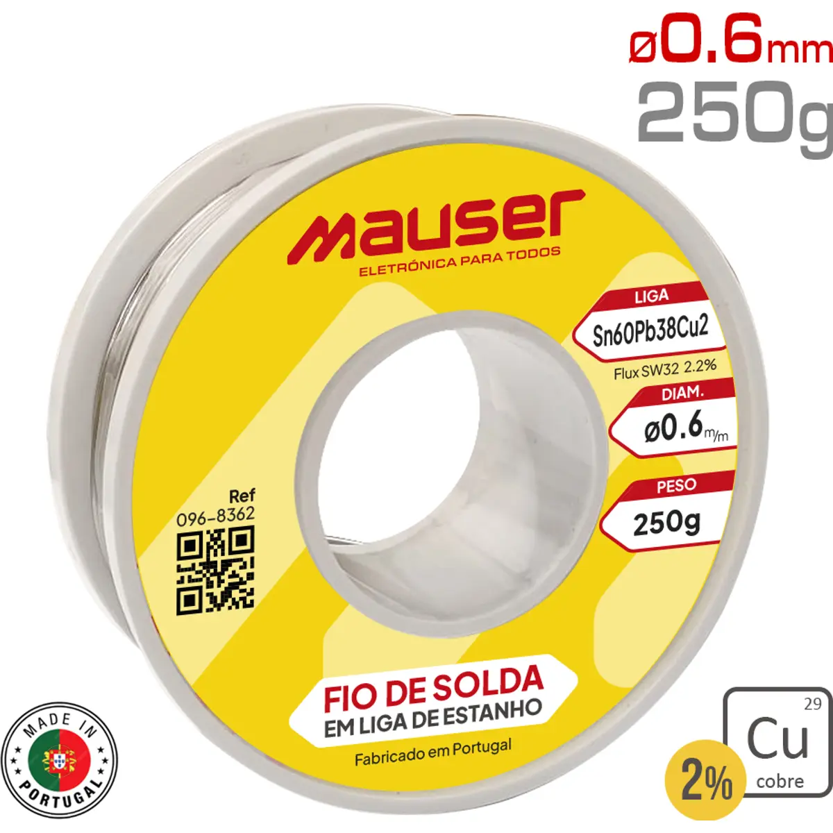 Solda em fio com adição de cobre para melhor condutividade, núcleo ativado com fluxo SW32 de resina sem halogénio, diâmetro Ø0.6 mm e peso de 250 g. A composição Sn60Pb38Cu2 oferece fusão entre 183 e 190°C e densidade de 8.5, com fluxo de 2.2%. Fabricada em Portugal, ideal para ligações rápidas, estável e com boa condução elétrica.