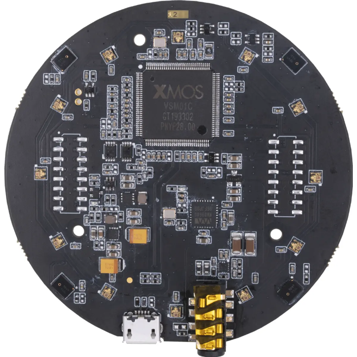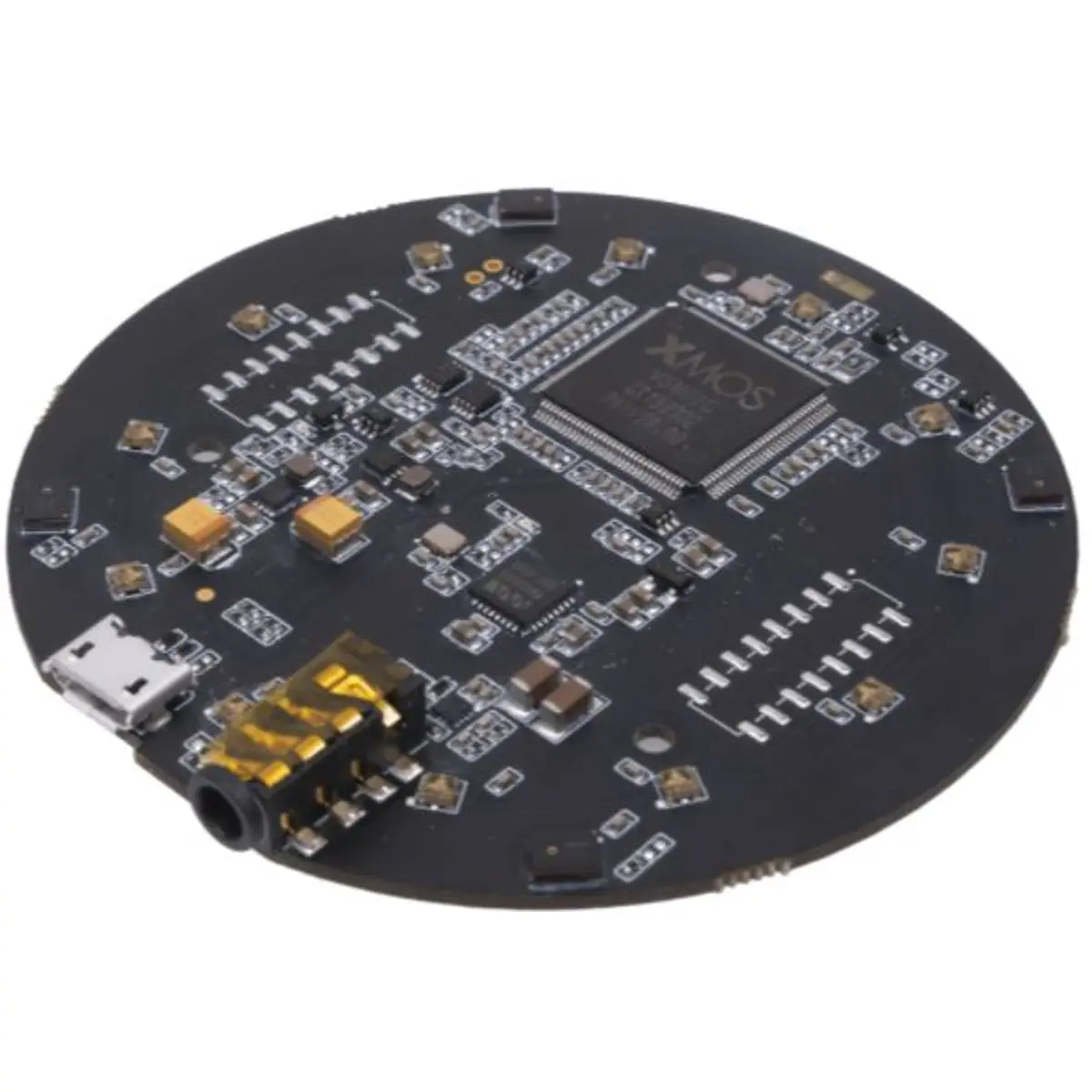Placa de desenvolvimento com 4 microfones MEMS para interface de voz. Captação de voz a distância até 5 metros com algoritmos de fala on-chip, alimentados pelo XMOS XVF-3000. Possui 12 LEDs RGB programáveis, saída de áudio de 3,5 mm, e alimentação de 5 V DC via Micro USB ou conector de expansão. O design oferece diâmetro de 70 mm e é adequado para projetos de IoT, automação e assistentes de voz integrados.