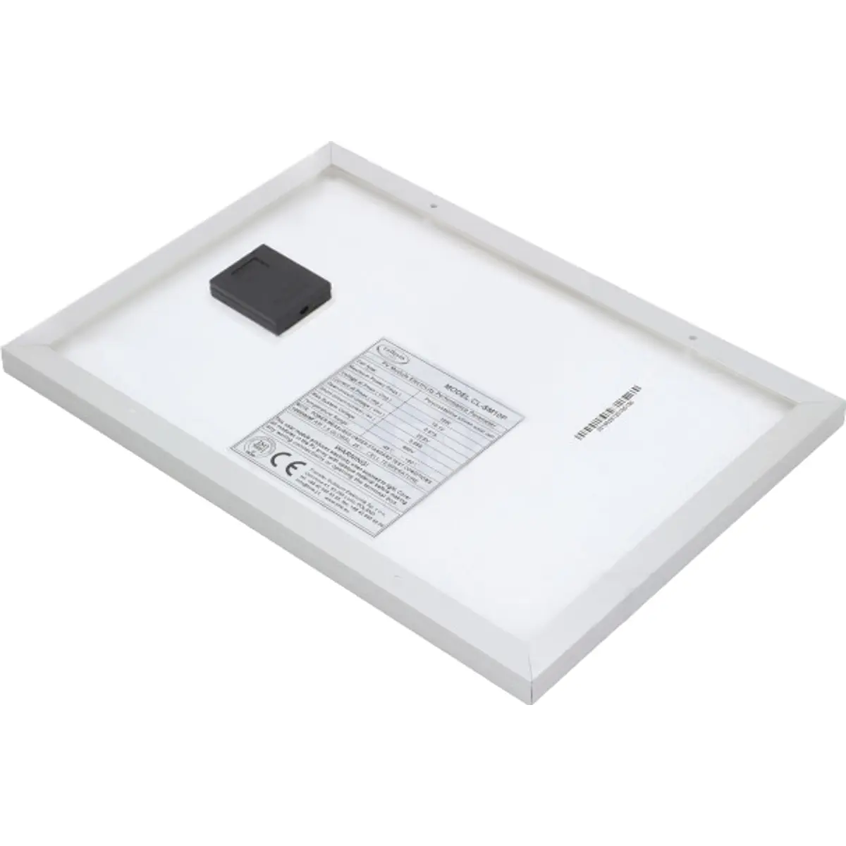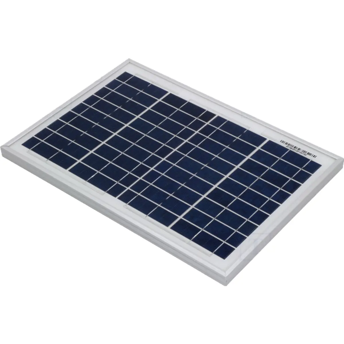 Painel fotovoltaico policristalino para sistemas de 12V, com potência máxima de 10W e tensão na potência máxima de 18,2V. Possui corrente de potência de 0,55A e corrente de curto-circuito de 590mA. Dimensões externas de 354 x 251 x 17 mm, oferecendo uma solução solar compacta para instalação em espaços limitados e aplicações que requerem energia estável.