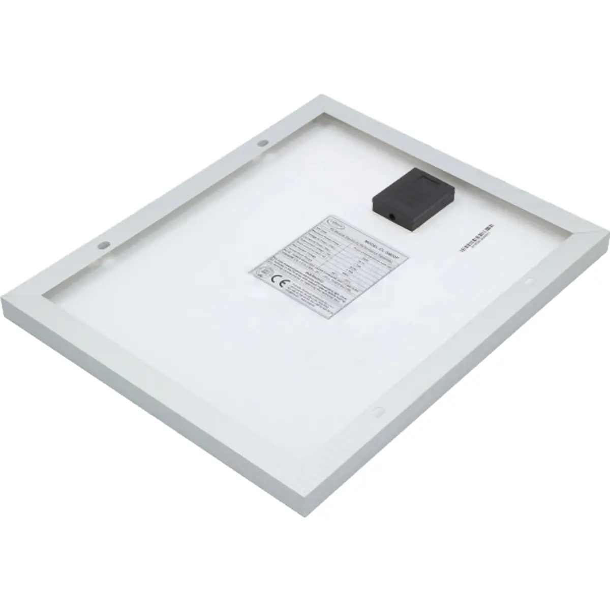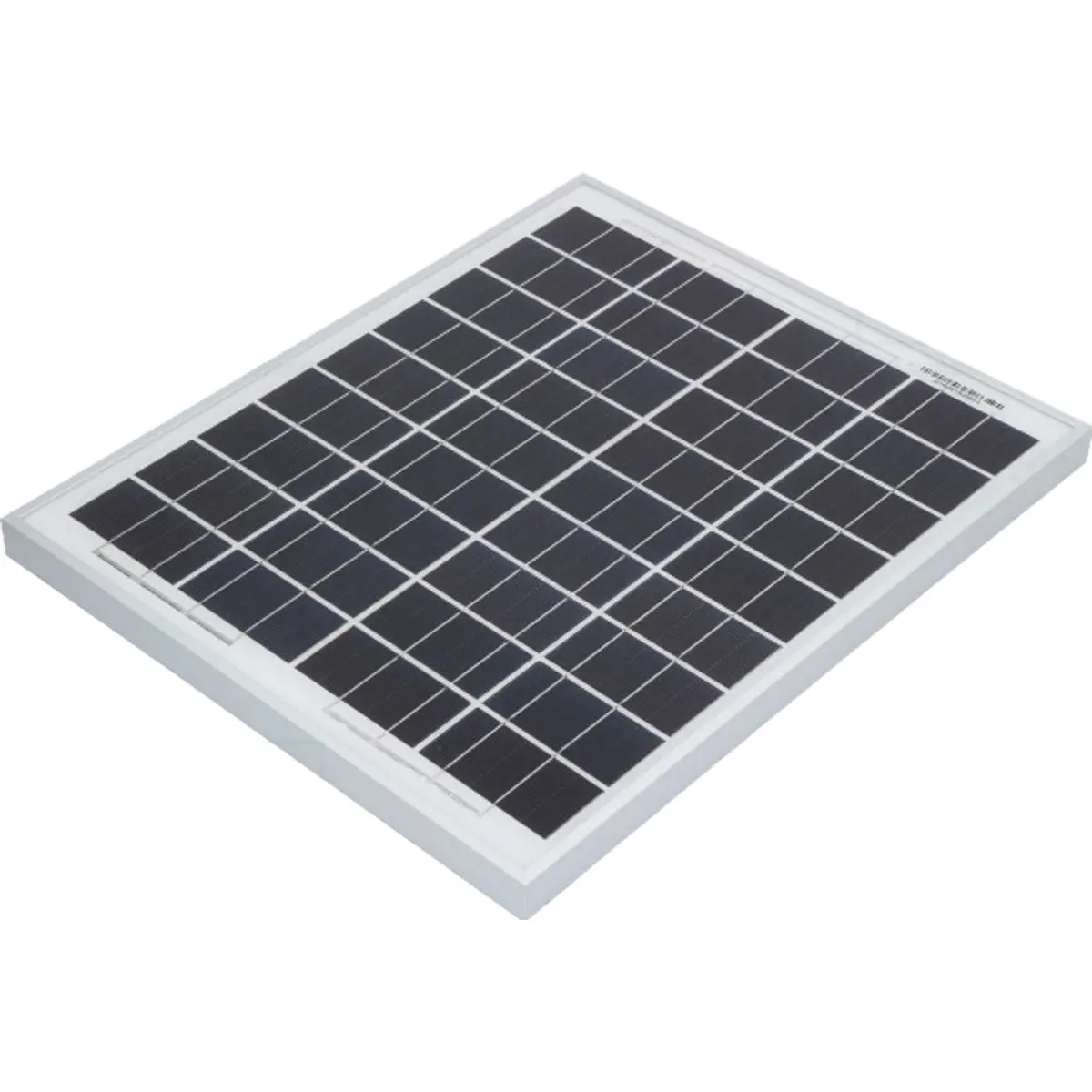 Painel fotovoltaico policristalino de 12V com 20W de potência. Vmpp 18.2V e Voc 22.6V, Impp 1.12A e Icc 1.18A. Peso 2.1 kg e dimensões externas 435 x 356 x 30 mm.