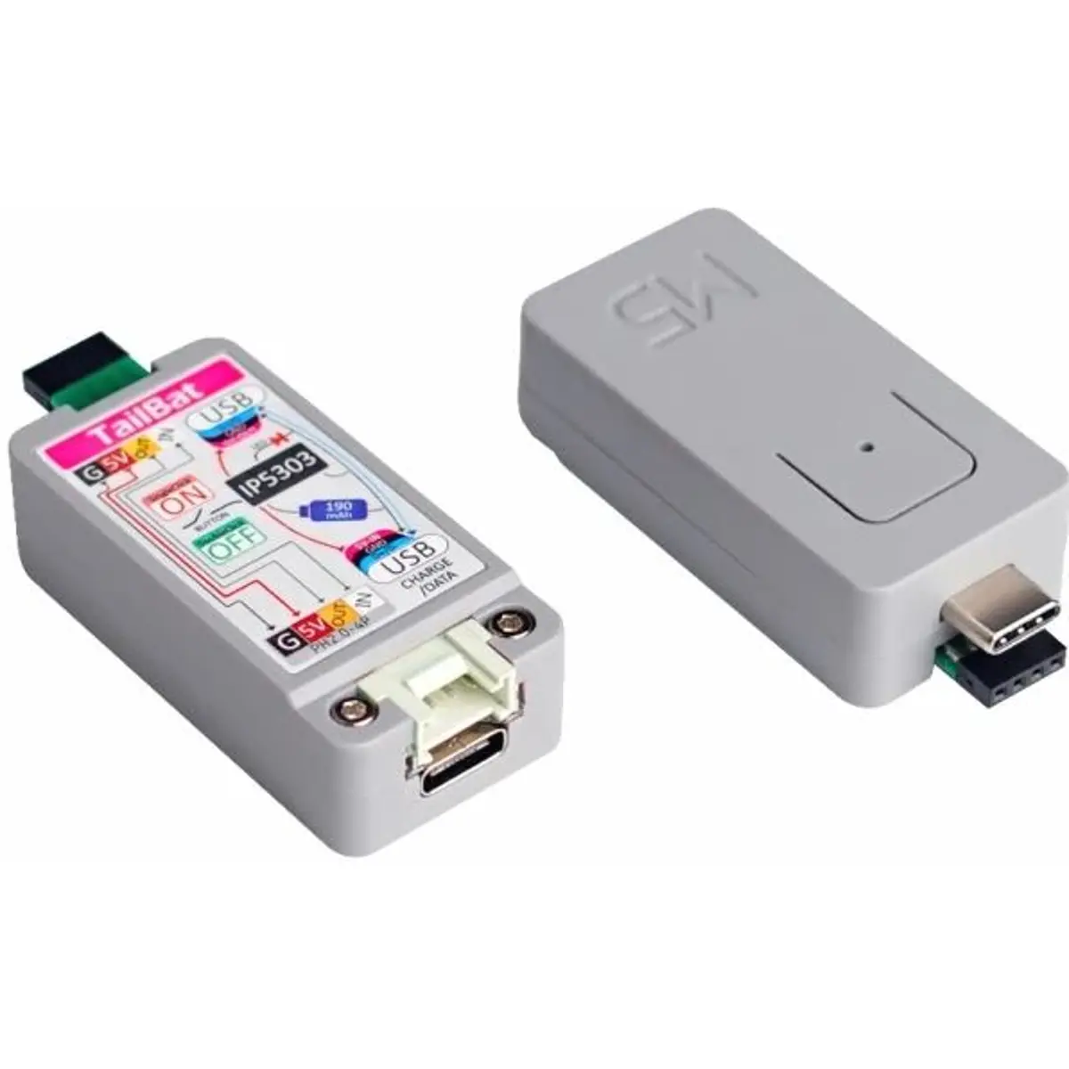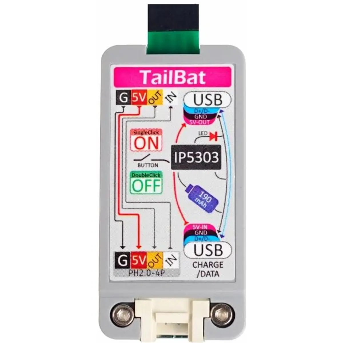 TailBat é um acessório de bateria externo projetado para o M5ATOM. Se o módulo TailBat for inserido no M5ATOM, ele poderá fornecer diretamente energia ao M5ATOM, permitindo que o M5ATOM seja usado em aplicativos móveis. O TailBat contém uma bateria de 190mAh e possui um botão físico. É controlado pelo chip de gerenciamento de energia IP5303. Quando a energia é ligada, a luz indicadora vermelha acende. O método de operação é o mesmo do M5Stack Core: Clique uma vez para ligar, clique duas vezes para desligar. Como o TailBat foi projetado simplesmente para adicionar energia da bateria, não afetará o modo de conexão GROVE original nem a funcionalidade USB. A bateria embutida pode ser carregada apenas através da interface USB typeC, e não através da interface Grove.
