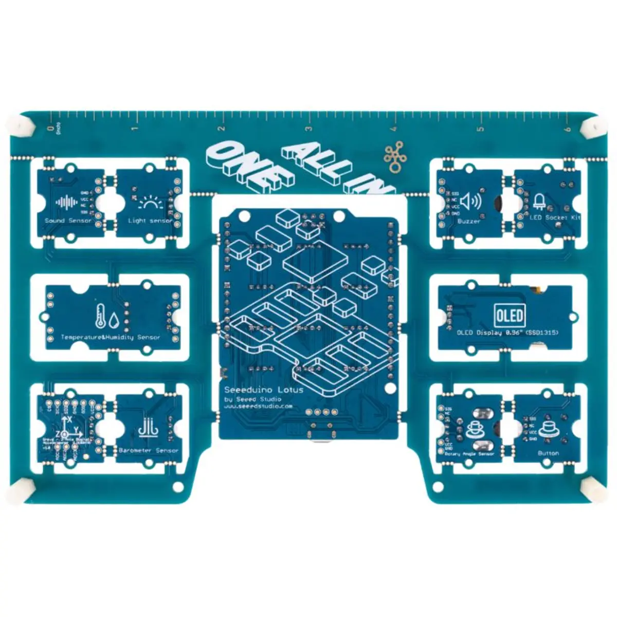 Todos os módulos foram conectados ao Seeeduino (microcontrolador) através dos orifícios da placa de circuito impresso, para que não sejam necessários cabos Grove para conectar. Assim este kit é ideal para o ensino onde não são necessários fios nem soldaduras.