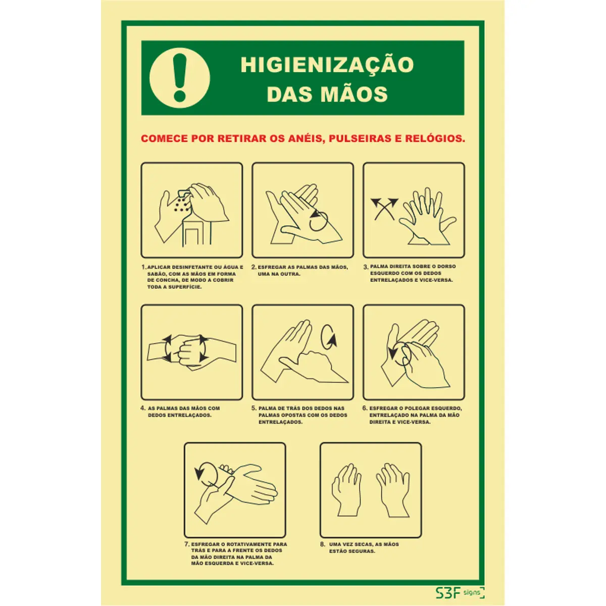 Placa de sinalização em PVC rígido de 2 mm de espessura, auto-extinguível, com elevada resistência e durabilidade. Não contém substâncias tóxicas, fósforo, chumbo ou aditivos radiativos. A impressão é digital, usando tintas de elevada qualidade resistentes aos raios UV, assegurando boa legibilidade e durabilidade sob exposição solar. Possui certificação ISO 9001:2008 e ISO 14001:2004, bem como CERTIF, comprovando conformidade de qualidade e gestão ambiental. Ideal para sinalização de higienização das mãos.