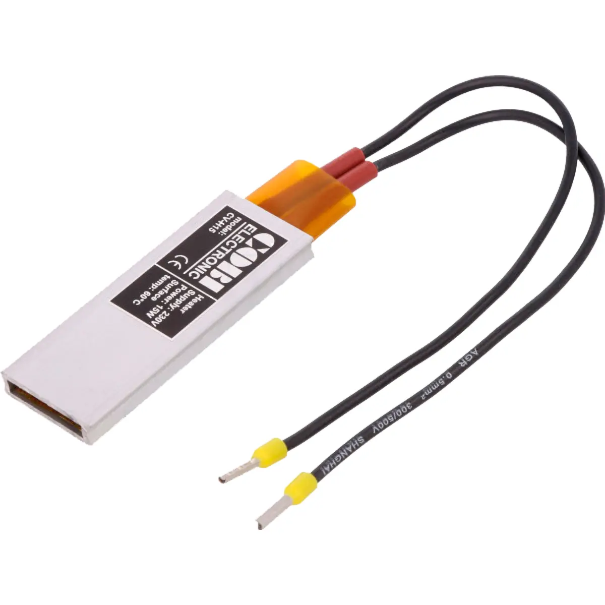 Módulo de aquecimento com resistência de 15W, montagem adesiva, apto para operar entre -20 e 70 °C. Alimenta-se a 230V AC e oferece saídas com fios de isolamento 2x1,0mm2. Com dimensões externas de 21x60x5mm, é compacto e fácil de integrar em dispositivos que requerem aquecimento controlado e eficiente, ideal para aplicações industriais e de automação.