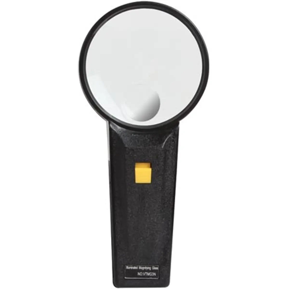 Lupa de mão com lente dupla: ampliação de 1,75x na lente principal e 3,5x na lente bifocal, dioptrias 3 e 10, diâmetro Ø80mm. Alimentação por duas pilhas AA de 1,5 V (não incluídas). Ideal para leitura detalhada e inspeção de peças pequenas, com iluminação para maior conforto em tarefas de precisão.