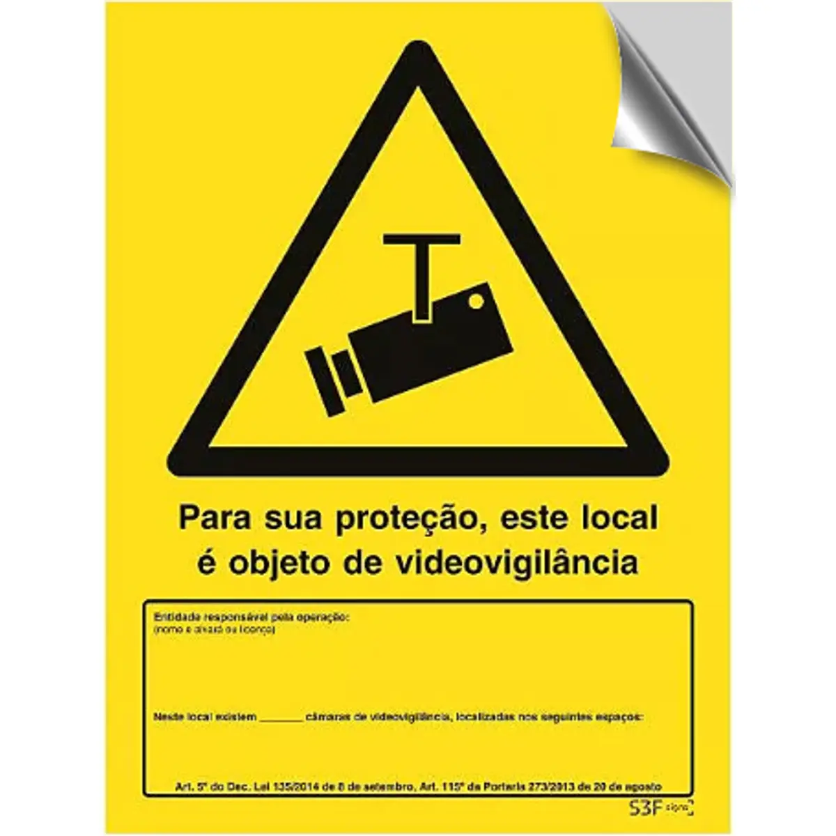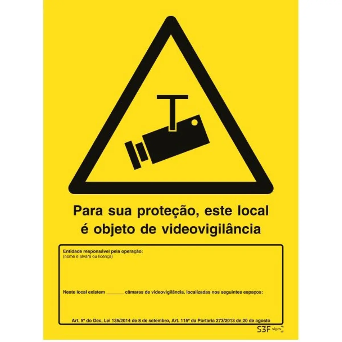 Vinil autocolante de sinalização para videovigilância, tamanho 150x200 mm, com indicação do número de câmaras. Destina-se a estabelecimentos, excluindo restauração ou bebidas com salas destinadas a dança ou espaços para prática desportiva. Em conformidade com o Art. 31º da Lei 46/2019 de 8 de Julho e com o Art. 115º da Portaria 273/2013 de 20 de Agosto, alterada pela Portaria nº 292/2020, assegura transparência e cumprimento legal na sinalização de videovigilância, com aplicação prática e durabilidade.