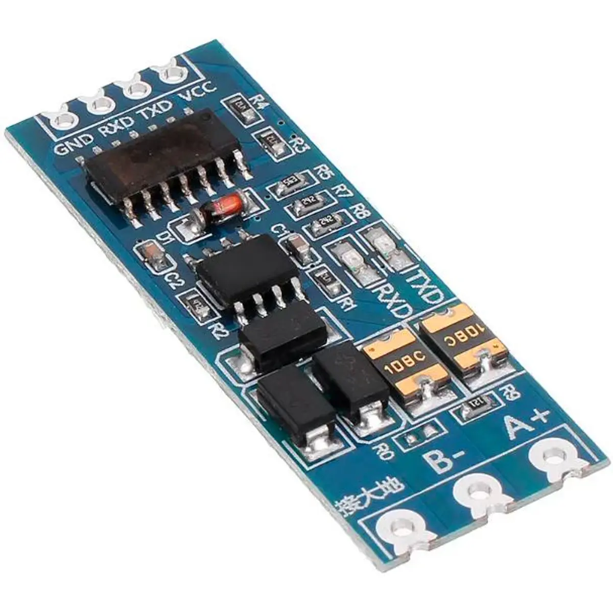 Conversor de sinal UART TTL para RS485, bidirecional. Permite a comunicação de dados entre diversos dispositivos, a longas distâncias (até 1km).