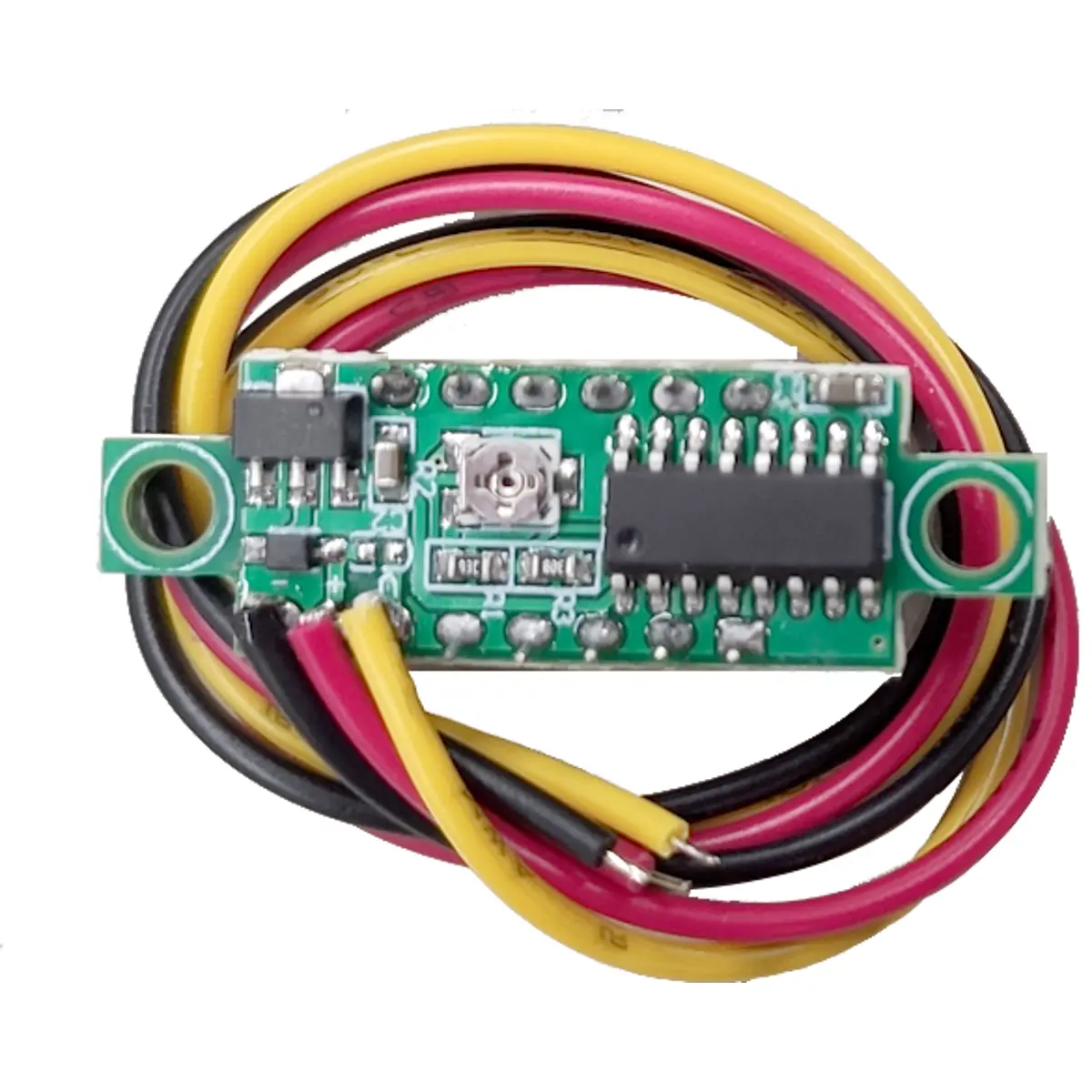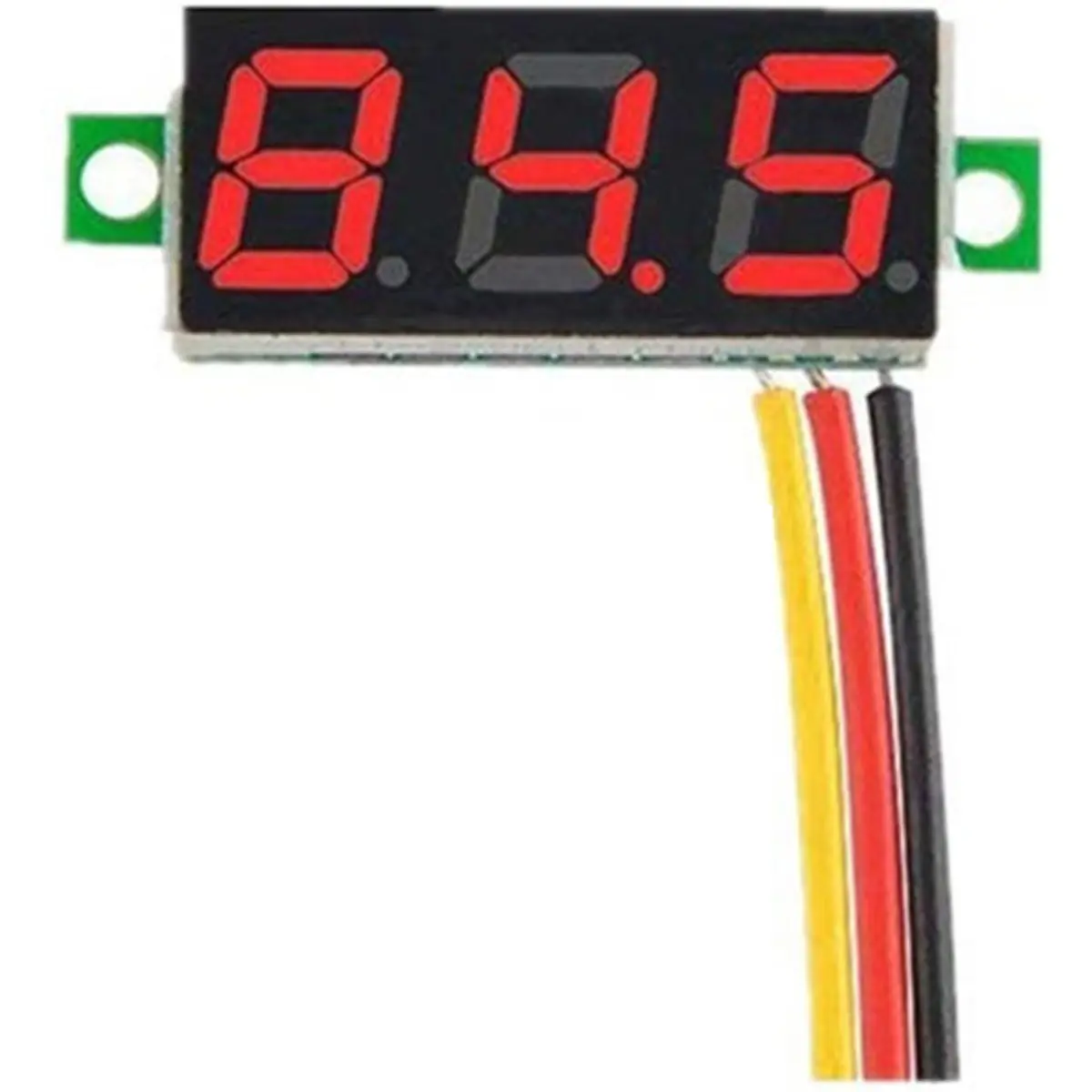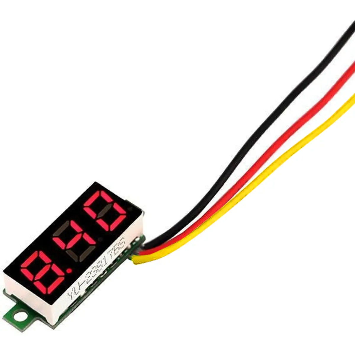Voltímetro LED compacto com faixa DC 0-30V e alimentação de 5-30V DC. Apresenta erro de até 1% (±1 dígito) e display de três dígitos de 0,28 polegadas. Medidas de 3,30x1,10x0,70 cm, tempo de resposta de ~200 ms, consumo típico de 5-15 mA, furo de montagem 23x10,5 mm. Temperatura de funcionamento entre -10 °C e +65 °C. Conexões: vermelho para alimentação, preto para negativo e amarelo para a tensão a medir (0-30 VDC).