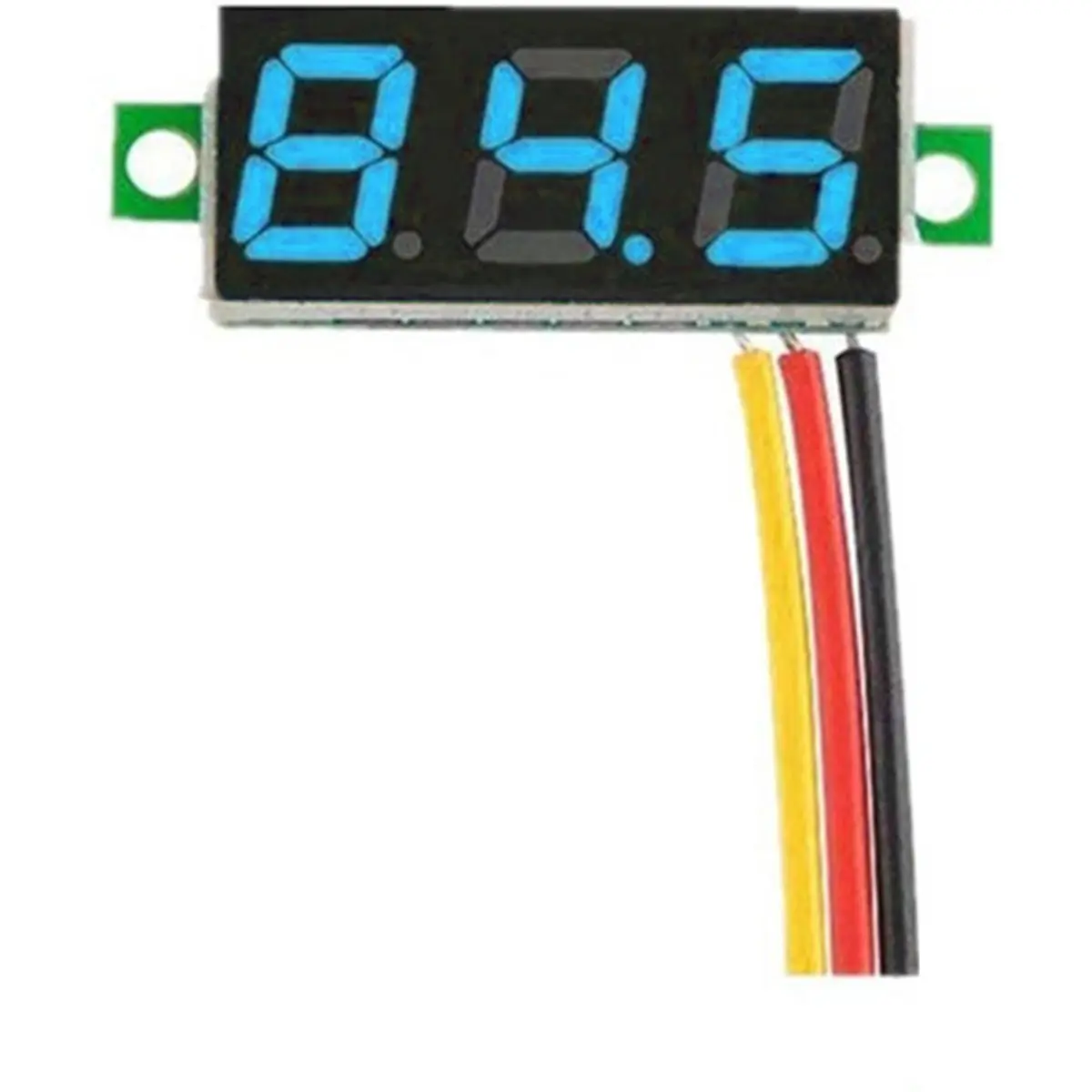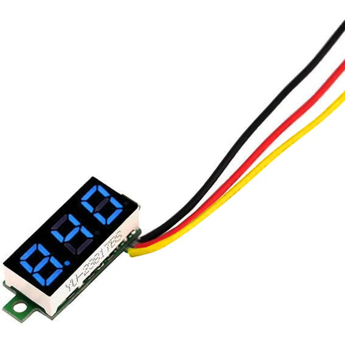 Este voltímetro LED mini mede 0-30V DC com alimentação entre 5 e 30V DC, exibindo até 3 dígitos numa tela de 0,28 polegadas. Consome tipicamente menos de 20 mA, tornando-o adequado para projetos eletrónicos sem consumir muita energia. Possui formato compacto (3,30 x 1,10 x 0,70 cm) com furo de montagem de 23 x 10,5 mm. Opera de -10 °C a +65 °C e tem tempo de resposta de cerca de 200 ms. As ligações são codificadas por cores: vermelho para alimentação, preto para negativo e amarelo para a tensão a medir. Versão azul.