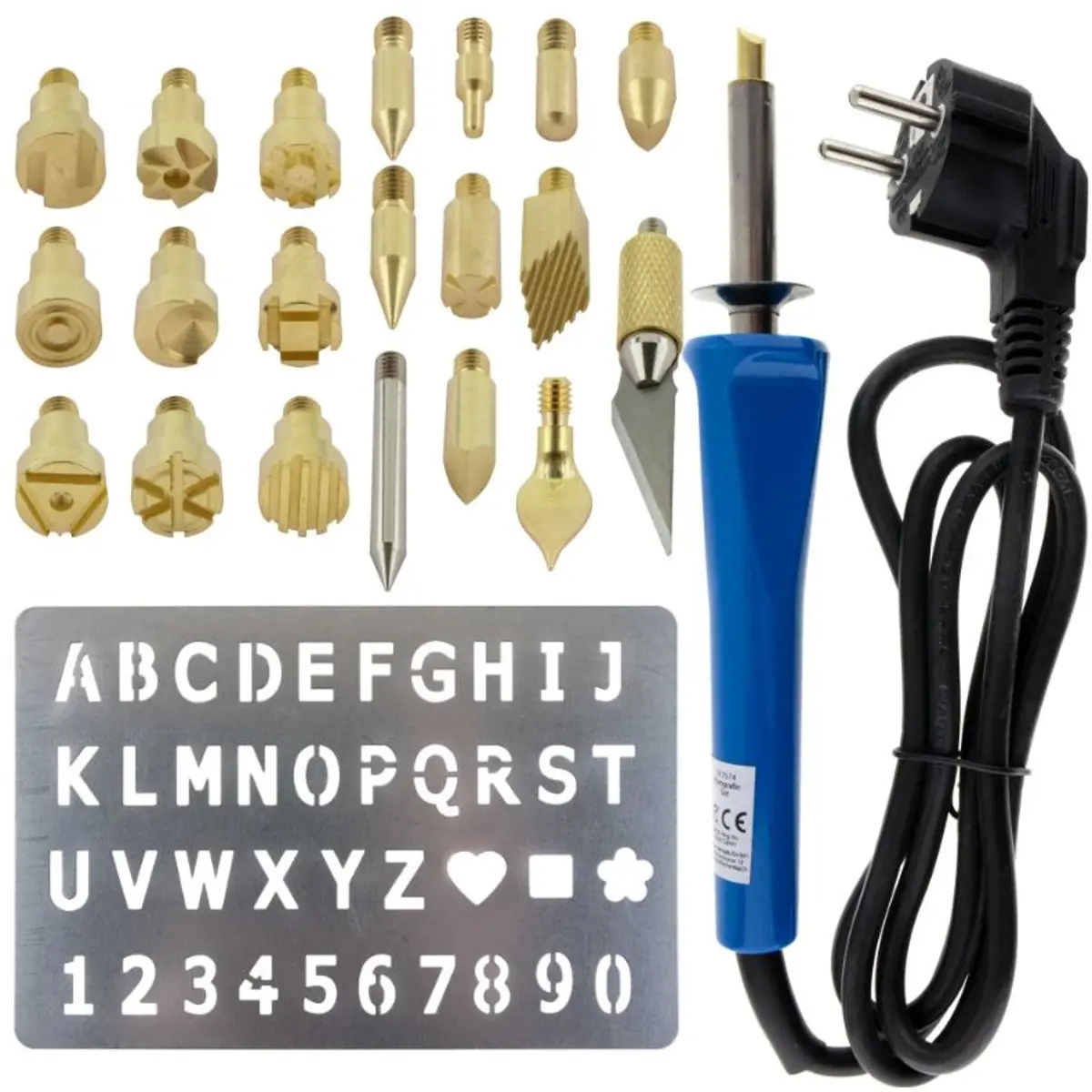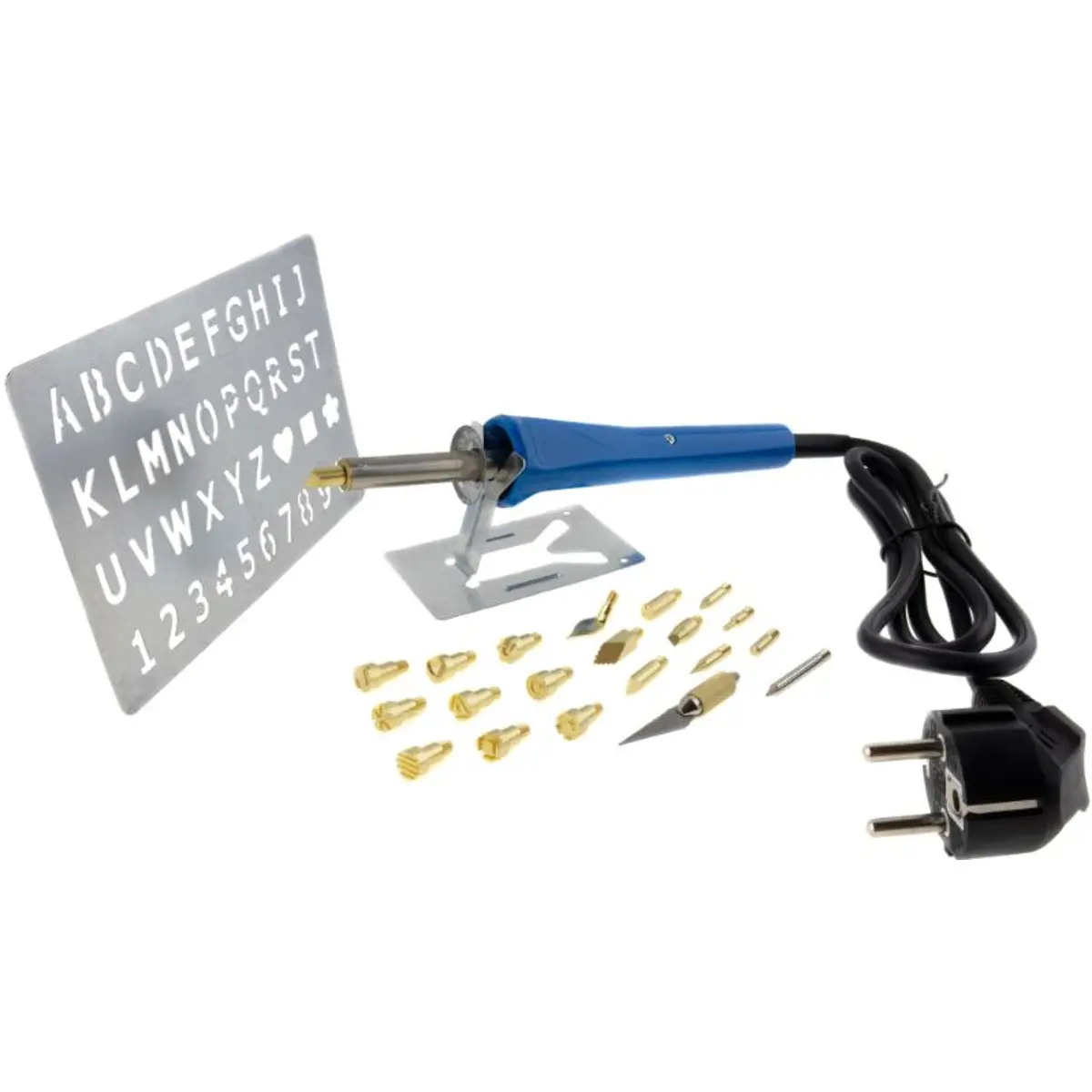 Este conjunto de pirogravador, com 230V e 30W, permite gravar madeira e outros materiais queimando a superfície para criar decorações artísticas. Inclui o ferro, 21 pontas de diversas formas, um stencil com letras e números, uma caixa de armazenamento e um manual de operações. Entre as pontas estão 9 carimbos, 10 formatos variados, 1 ponta de soldar, 1 porta-lâminas e 1 lâmina de corte a quente. Ideal para trabalhos manuais detalhados, oferece versatilidade de efeitos, desde gravuras finas a decorações com texto, com armazenamento conveniente para organização.