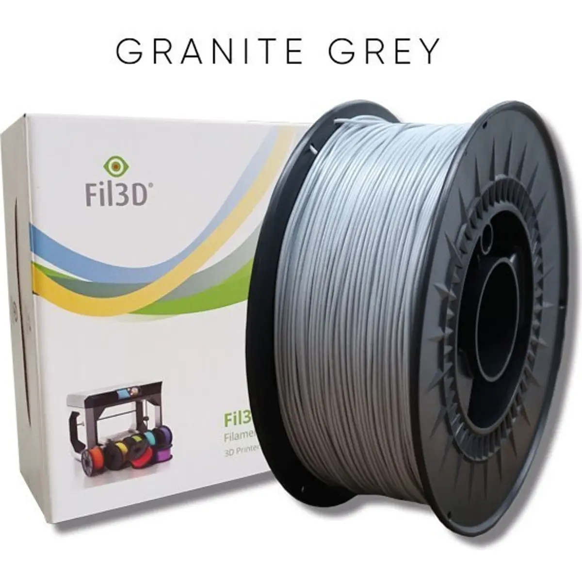 Filamento de impressão 3D em PETG diâmetro 1,75 mm, cor granito cinza. Oferece elevada rigidez, boa transparência e facilidade de impressão, com resistência mecânica de 50 MPa (deformação) e 29 MPa (rotura), alongamentos de 5% e 140%, densidade 1,27 g/cm3. Compatível com normas FDA, CE 1935/2004 e REACH; pode contactar alimentos (exceção álcool >25%) e pele. Temperaturas típicas: 230°C (±20°C) e leito a 60°C (±10°C). Ventilação recomendada; velocidade de impressão ajustável.