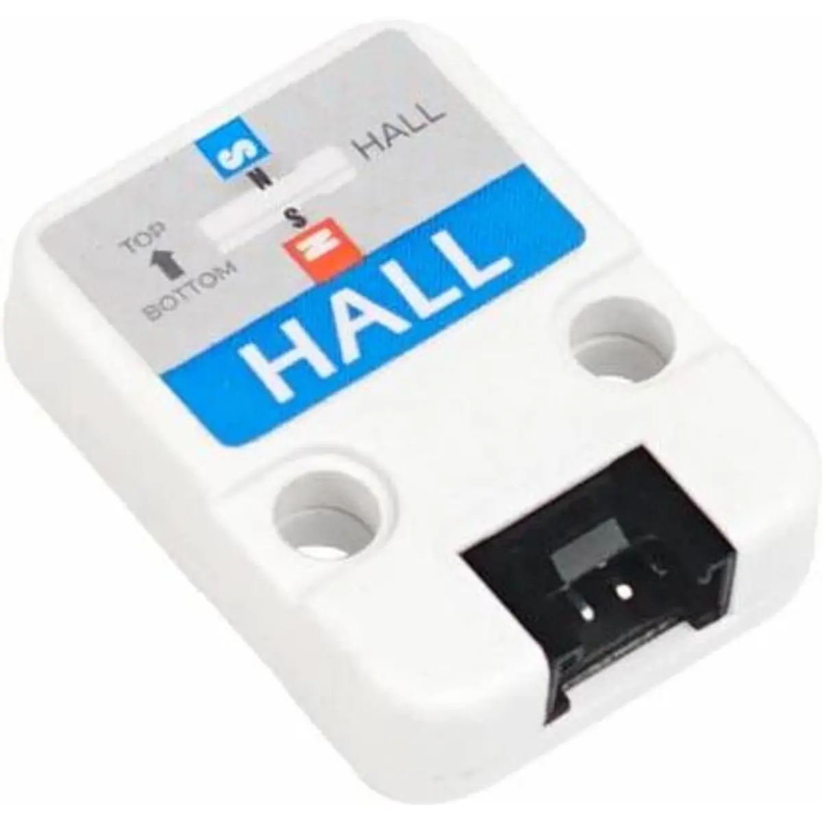 Unidade de efeito Hall . Três switchs do sensor A3144E Hall são integrados internamente, os quais são processados ​​pelos circuitos integrados de porta da série 74HC. O sinal de baixo nível pode ser gerado quando o pólo S magnético está perto do topo do sensor ou o pólo N está perto da parte traseira, e o indicador LED interno acenderá. É amplamente utilizado em aplicações como alarmes de sensores de portas, sensores de proximidade, medição de velocidade de rotação e assim por diante. O lado frontal é o pólo norte, e o nível baixo é emitido quando o sinal do pólo sul do campo magnético é detectado.