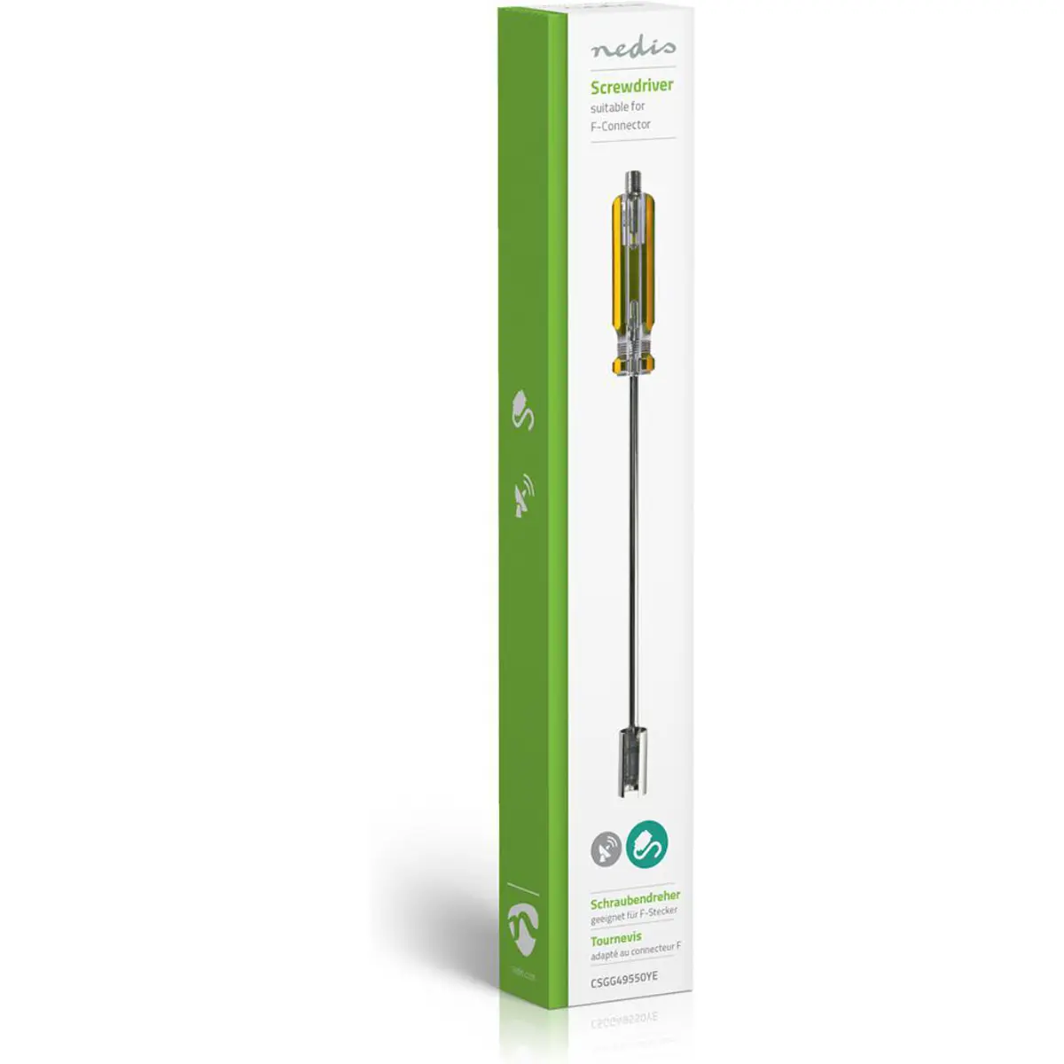 Chave manual para aperto e desaperto de conectores do tipo F com porca, especialmente útil em locais de difícil acesso.