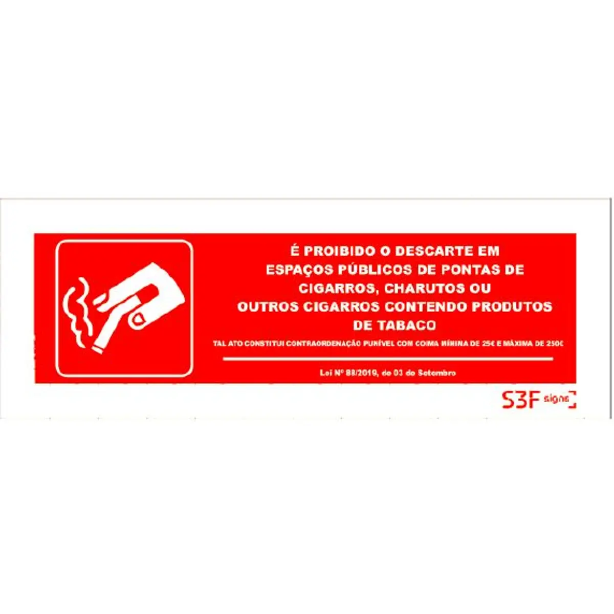 Placa de sinalização em PVC rígido de 2 mm de espessura para exteriores, dirigida a indicar a proibição de descarte de beatas de cigarro em espaços públicos. Impressão digital de elevada qualidade com tintas resistentes aos raios UV. Não tóxica, sem fósforo, sem chumbo e sem aditivos radiativos. Certificações ISO 9001:2008, ISO 14001:2004 e CERTIF asseguram qualidade e conformidade. Dimensões 250 x 160 mm, ideal para instituições, espaços comerciais, cafés e restaurantes, em conformidade com a legislação.