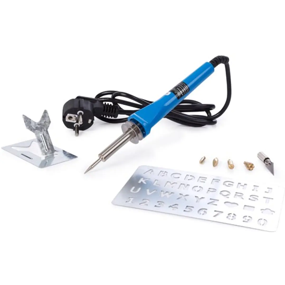 Conjunto básico de pirogravador/ferro de soldar de 30 W para uso em oficinas e projetos manuais. Permite gravação em madeira, utilização de faca quente e soldadura, com molde de gravação incluído. Alimentação de 220-240 V AC (50 Hz) assegura compatibilidade com redes domésticas. Ideal para personalizar objetos, criar peças decorativas e desenvolver trabalhos artesanais com precisão, facilidade de manuseamento e versatilidade, mantendo custos baixos e operação estável.