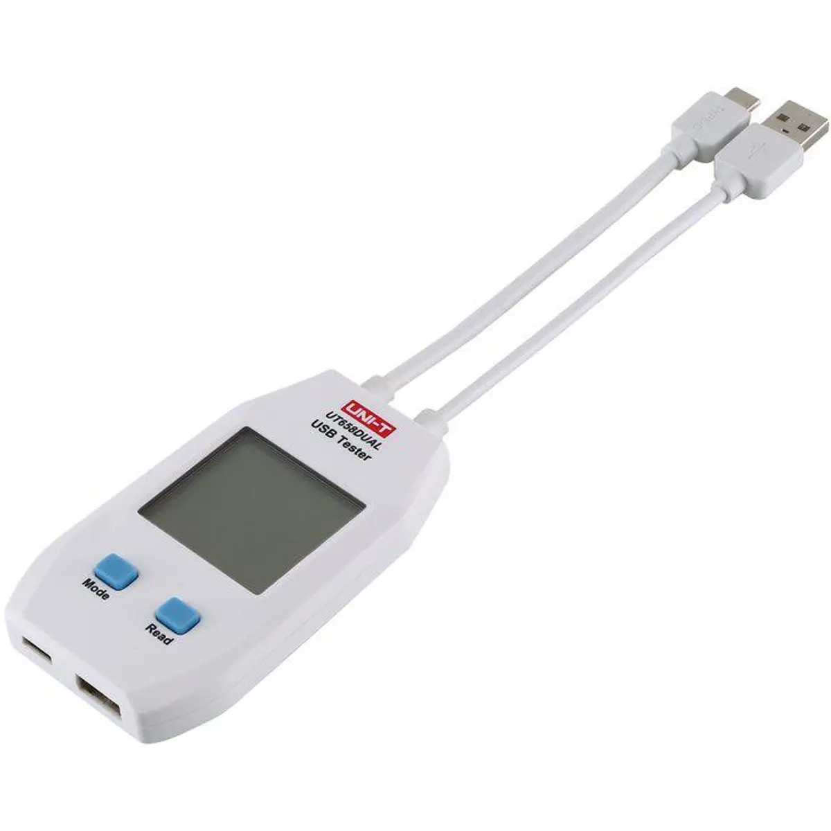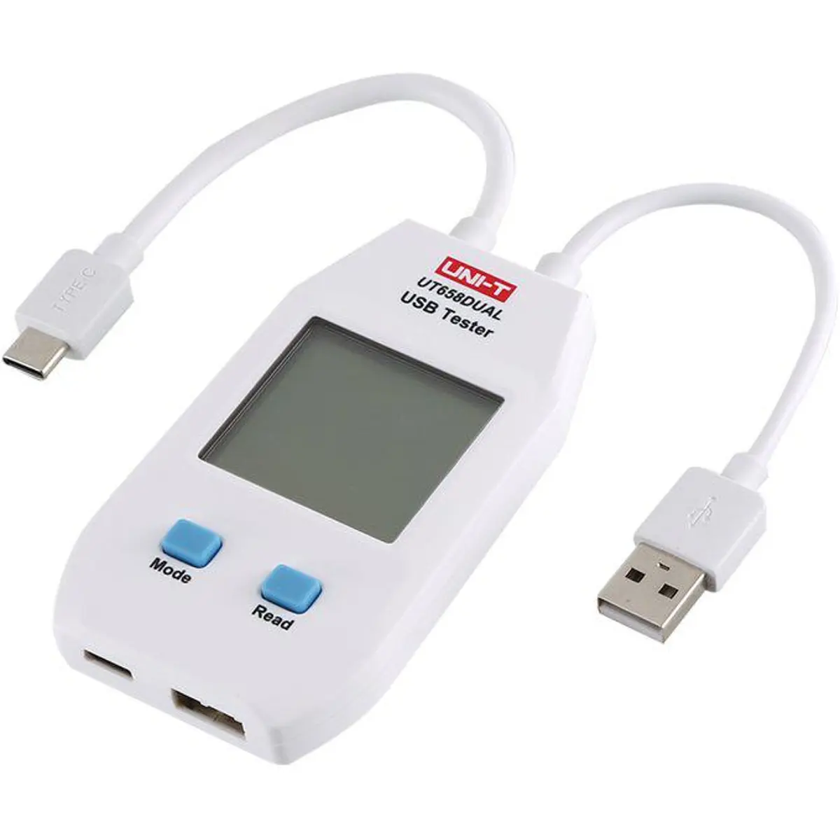 O UT658DUAL é um medidor USB de segunda geração que testa carregadores, baterias portáteis, cabos USB tipo A e C e outros dispositivos de carregamento. Mede tensão de saída, corrente, energia, capacidade e resistência do circuito, bem como as tensões D+ e D- (0-3,3 V). Armazena dados em até 10 memórias e regista até 99 h 59 m 59 s. Suporta portas Tipo-A e Tipo-C, protocolos USB 2.0/3.0/4.0 e Carga rápida QC 3.0/4.0. É compacto (93 x 55 x 13 mm), pesa 65,8 g e é branco. Nota: não permite utilizar as duas portas simultaneamente.