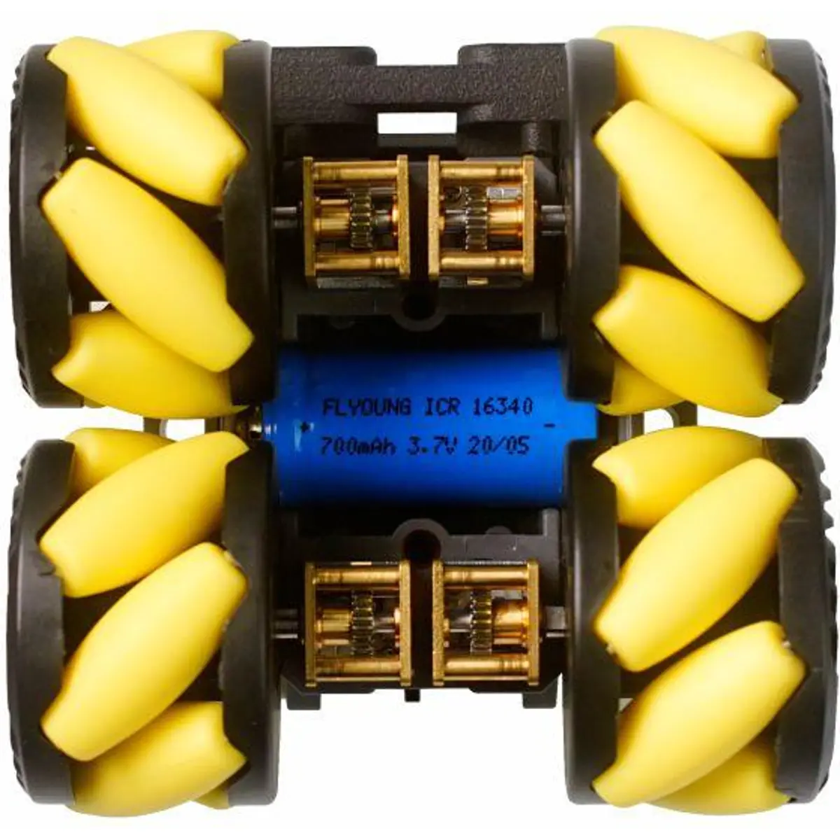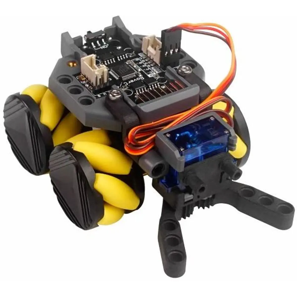 Base robô móvel omnidirecional com rodas mecanum, programável e compatível com módulos de expansão. Possui mecanismo de preensão acionado por servo com dois drivers dedicados, oferecendo controlo de preensão em tempo real. Equipado com quatro canais de motor driver, endereçamento I2C 0x38 e portas de expansão para módulos adicionais. A bateria substituível de 16340 (700mAh) permite recarga através do sistema de alimentação e mantém o robô a funcionar com controlo remoto. Movimento em todas as direções.