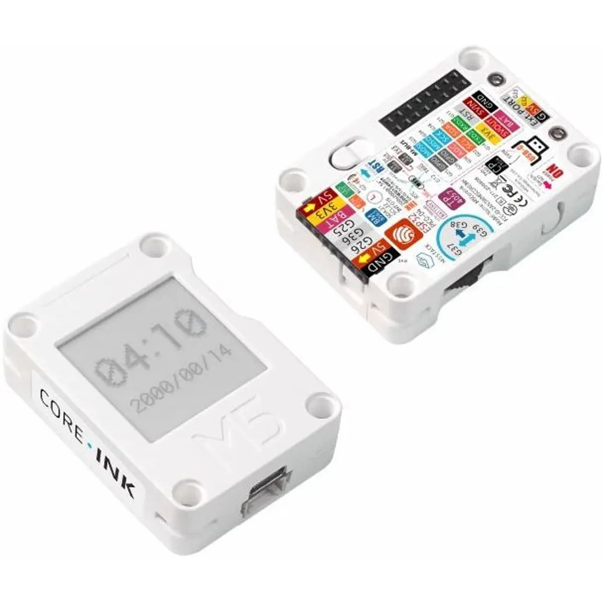 CoreInk é um novo display E-ink na linha de núcleos M5Stack. Controlado pelo ESP32-PICO-D4 Este novo dispositivo inclui uma tela E-Ink preta e branca de 200x200 1,54 ". Em comparação com um LCD normal, as telas E-ink são de mais fácil leitura para os olhos, o que os torna uma ótima escolha para leitura ou visualização por períodos mais longos. Outros benefícios são o baixo consumo de energia e a capacidade de reter a imagem mesmo sem energia no display.