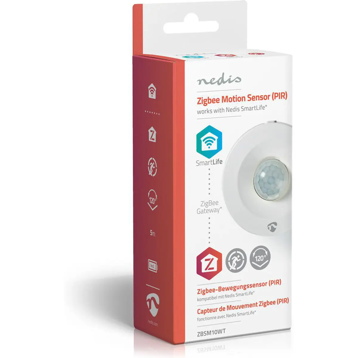 Este sensor de movimento PIR (infravermelho passivo) inteligente reconhecerá o movimento físico a uma distância de até cinco metros e a um ângulo de 120 °. Você pode enviar essas informações para seu aplicativo Nedis SmartLife. Para fazer isso, você precisará de um gateway Nedis Zigbee