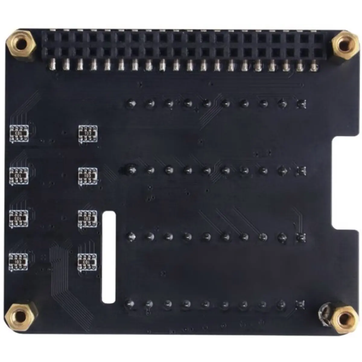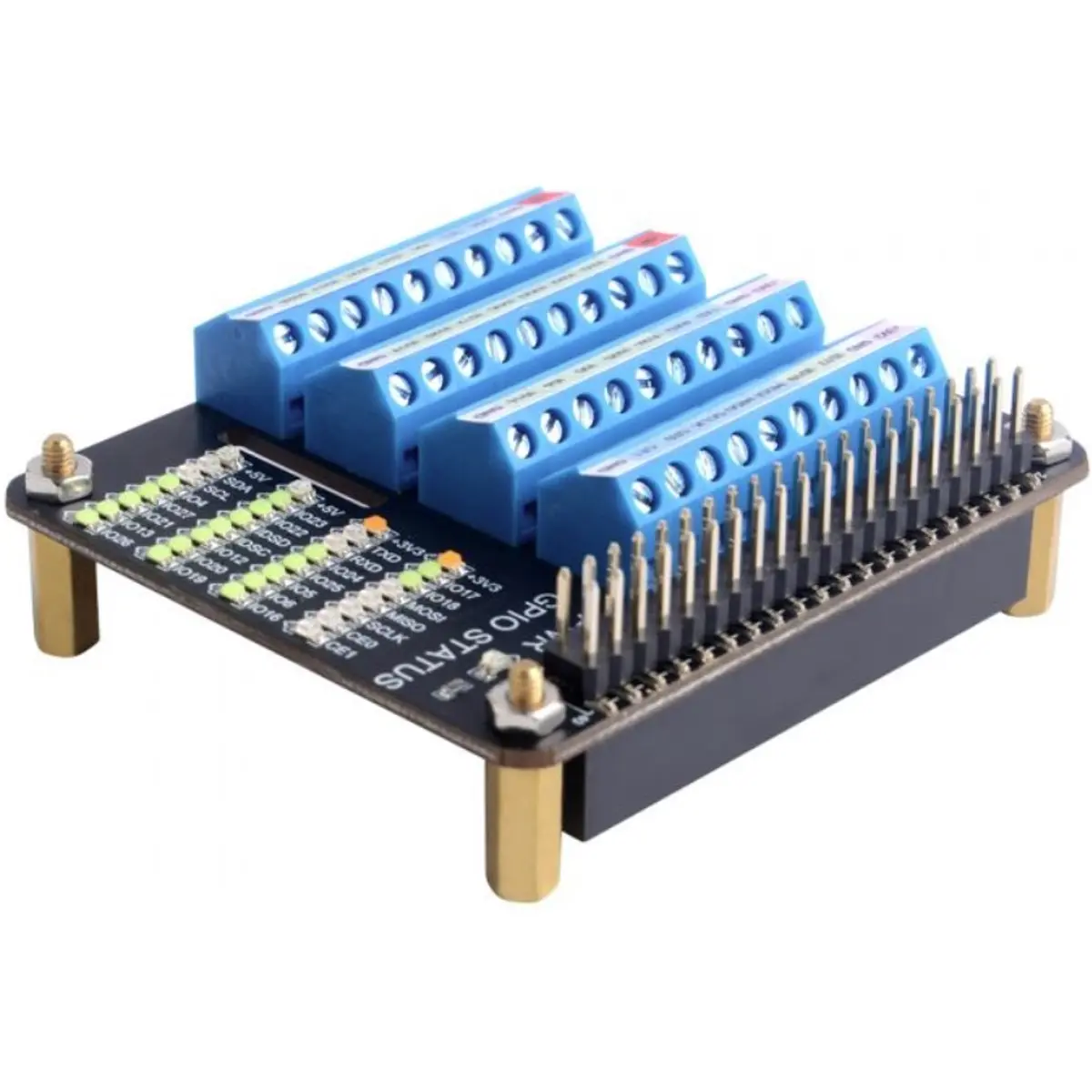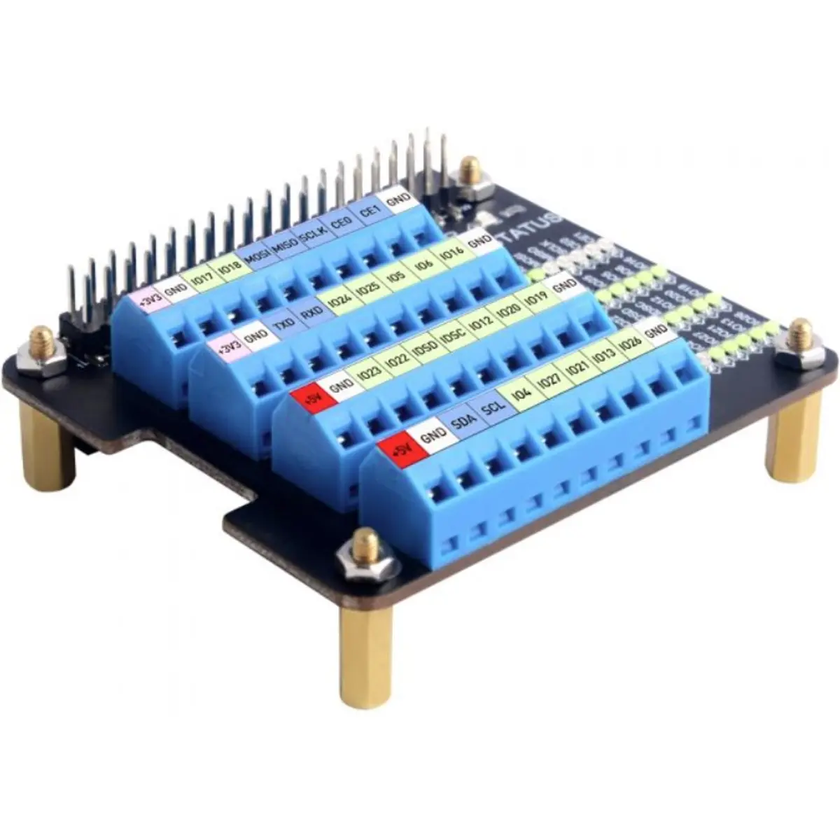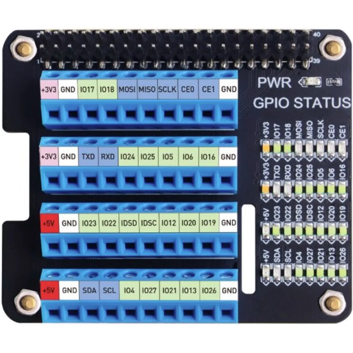 Esta placa de extensão (HAT) com terminais de parafuso, fornece ao seu Raspberry Pi a possibilidade de ligar fios aos pinos GPIO de uma forma fácil e cómoda. Todos os pinos podem ser numerados na parte superior com uns autocolantes (incluídos no conjunto) e o estado de cada pino pode ser observado na matriz de LEDs que se encontra ao lado. Alguns desses LEDs possuem cores diferentes de acordo com a sua funcionalidade, por exemplo, a luz de alimentação de 5 V é vermelha, enquanto que a luz de alimentação de 3,3 V é rosa; a luz do pino de função especial é azul escuro e a luz indicadora do pino GPIO comum é azul claro. Isto torna mais fácil a observação do funcionamento das suas experiências electrónicas e auxilia na deteção de problemas.