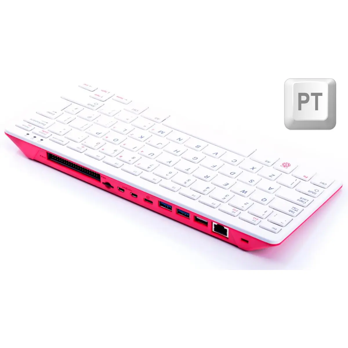 Ele é baseado num Raspberry Pi 4 que funciona com um Clock um pouco mais rápido (1.8 GHz em vez do usual 1.5 GHz) e redireciona as portas para que tudo, até mesmo as portas GPIO, fiquem acessíveis na parte de trás. Tudo o que você precisa estará literalmente integrado debaixo dos seus dedos enquanto você digita neste teclado de teclas semelhantes às de um laptop.