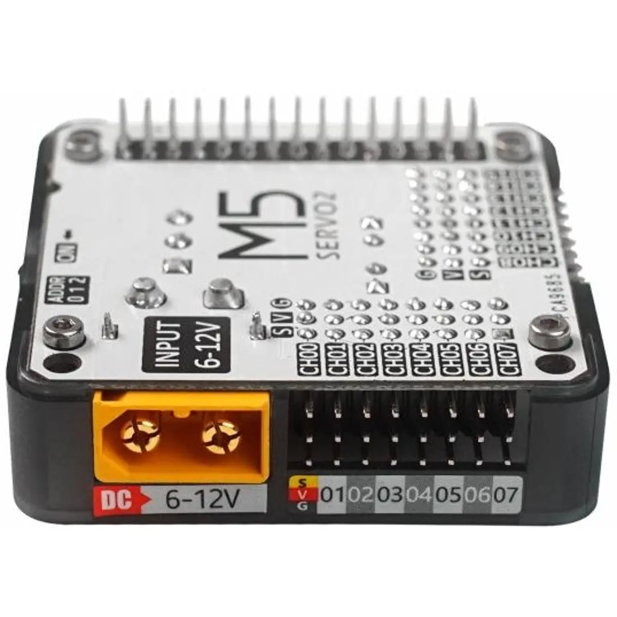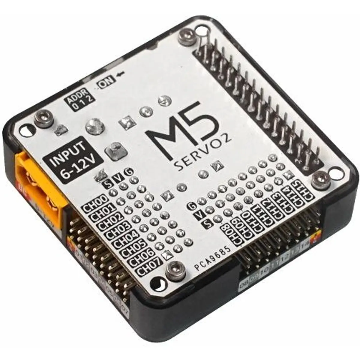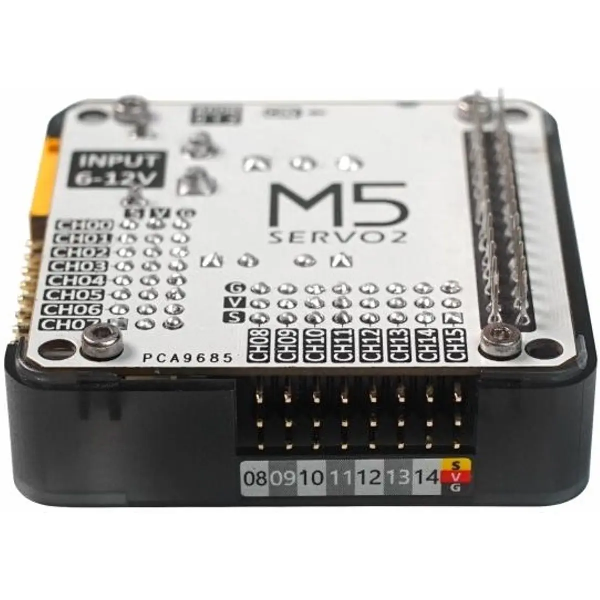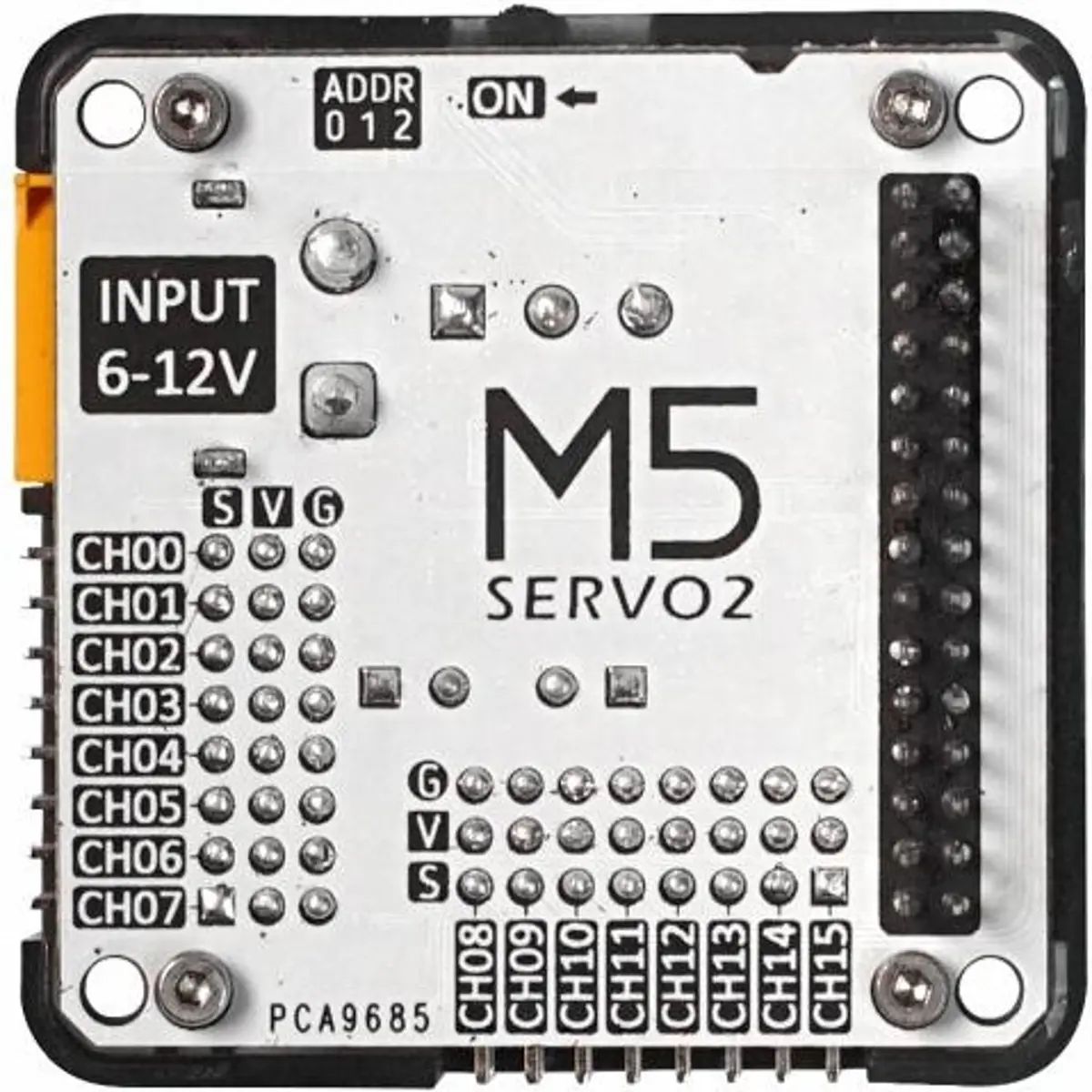 O SERVO2 é um módulo controlador de servo motores (driver) atualizado, da série de módulos empilháveis M5Stack. Ele usa um controlador PWM de 16 canais PCA9685 que permite controlar até 16 servo motores ao mesmo tempo.