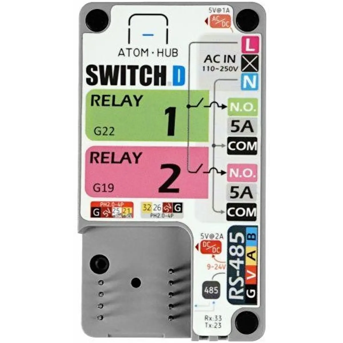 O Atom Hub Switch D é um kit de expansão com dois relés que pode ser controlado através do M5Atom. O D no nome significa "Direto", uma vez que a alimentação de 250V AC está conectada diretamente aos relés, o que facilita a ligação dos circuitos a serem controlados.
