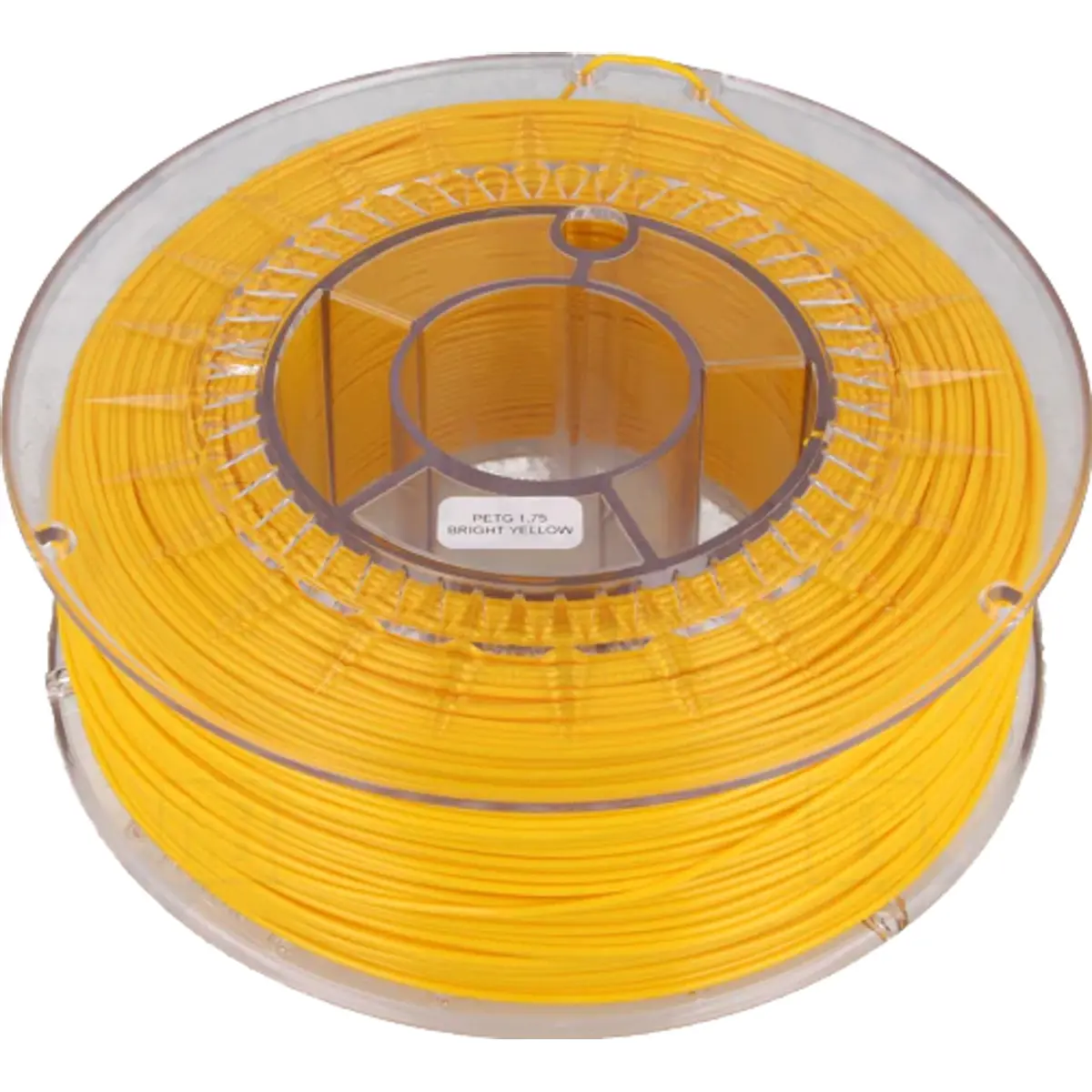 Filamento de impressão 3D em PETG, diâmetro 1,75 mm, cor amarela, embalagem de 1 kg. Compatível com impressoras FDM. A bobina é feita em policarbonato transparente, com diâmetro de 200 mm e largura de cerca de 70 mm; o orifício de suporte tem 52 mm. Densidade do material 1,23 g/cm³. Requisitos de impressão: fusão entre 220 e 250 °C, cama aquecida entre 70 e 80 °C; arrefecimento opcional. Ideal para peças funcionais com boa resistência ao impacto e acabamento brilhante.