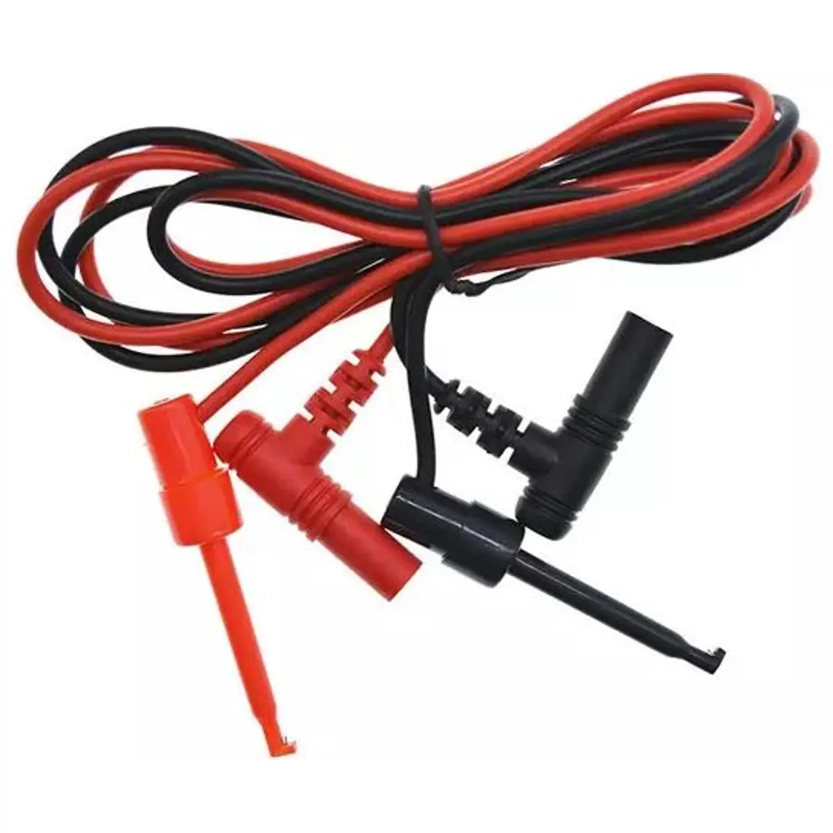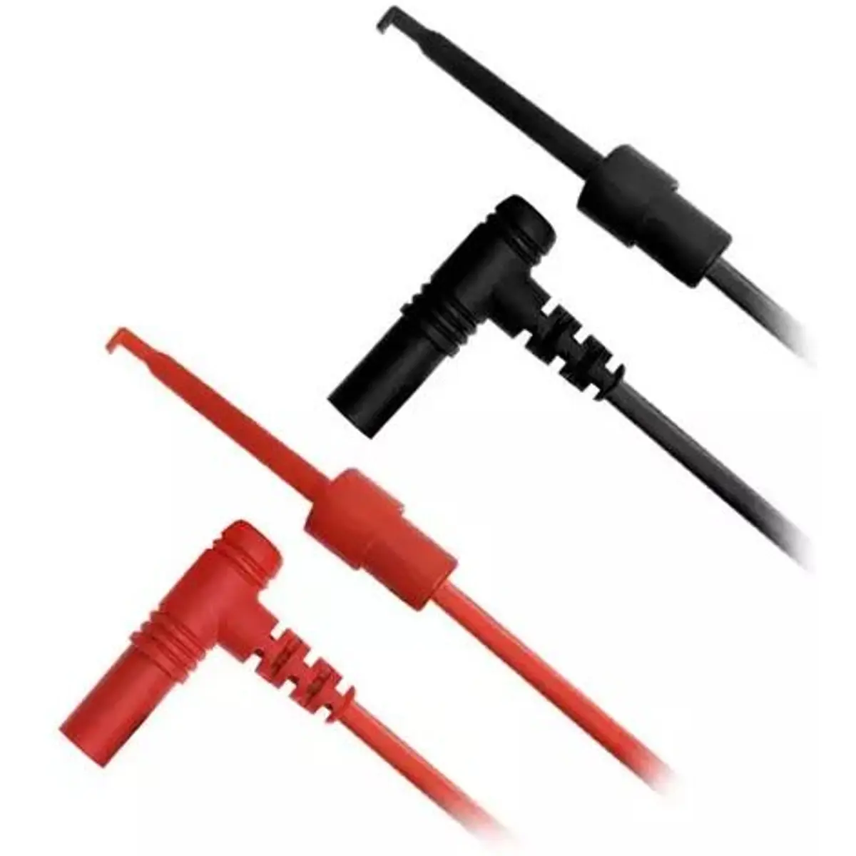 Pontas de prova com conectores banana de 4 mm, para medições elétricas. Oferece comprimento de 100 cm e condutor de 0,32 mm2, com ângulo de 90°. Compatível com instrumentos de teste como multímetros. Proporciona flexibilidade e segurança na ligação, ideal para trabalhos de bancada e ligações temporárias.