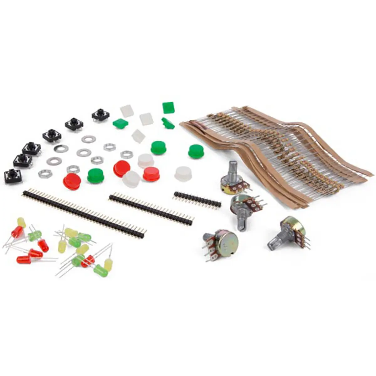 Kit de acessórios de eletrónica com 210 resistores e LEDs de várias cores, ideal para prototipagem. Inclui potenciómetros de 50K (K047AM), botões de 4 pinos com tampas redondas e quadradas, tampas, anilhas e porcas para potenciómetro, além de um cabeçalho macho de 40 pinos a 2,54 mm. Perfeito para aprender circuitos, montar protótipos e experimentar combinações elétricas com componentes discretos.