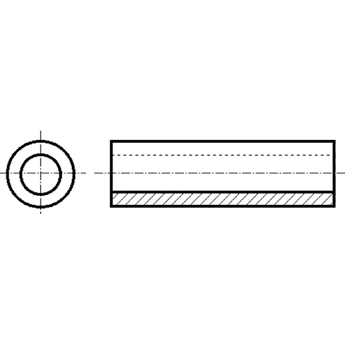 Espaçador cilíndrico, sem rosca, em poliamida, com diâmetro exterior de 5 mm, diâmetro interior de 3,2 mm e comprimento de 2,5 mm. Opera numa faixa de temperatura de -30 a 85 °C, proporcionando uma solução simples para manter o espaçamento entre peças sem necessidade de roscas.