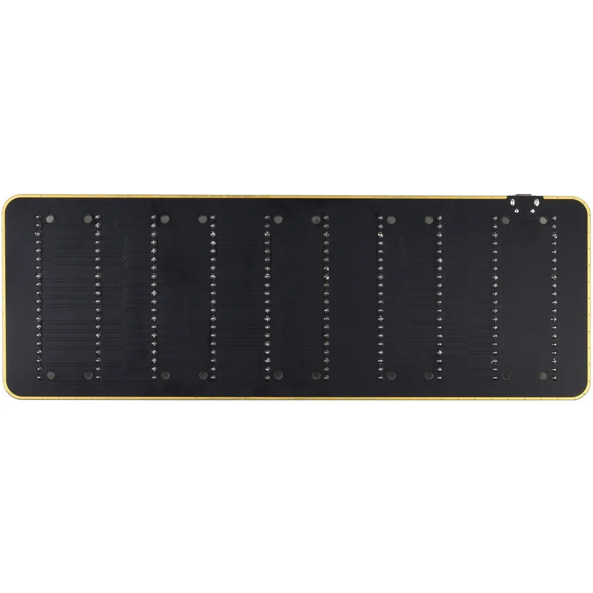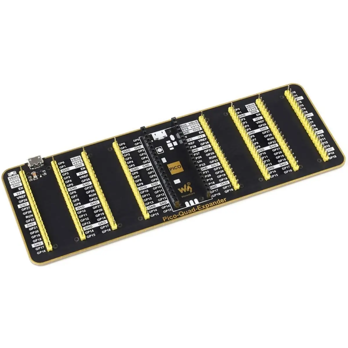 Placa de expansão para Raspberry Pi Pico que permite ligar até quatro módulos ao mesmo tempo, expandindo os pinos GPIO. Possui zona dedicada de ligação para o Pico com barras de pinos fêmea e quatro zonas com pinos machos rotulados para módulos de expansão. A alimentação USB na placa compensa necessidades de energia adicional. A base preta com etiquetas brancas e contorno dourado facilita a montagem e ocupa dimensões de 177 x 562. Ideal para projetos que exigem várias interfaces e uma montagem estável.