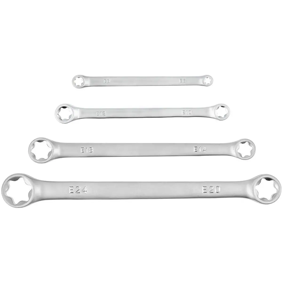 Conjunto de 4 chaves de lunetas com medidas E6 a E24, em liga de aço cromo-vanádio de alta qualidade. Cada peça pesa 110 g, proporcionando durabilidade e resistência. Ideal para montagem e manutenção de componentes finos, com encaixe preciso e boa manuseabilidade. Ferramentas compactas, leves e adequadas para oficinas, indústria e metalurgia, assegurando desempenho estável e fiabilidade ao longo do tempo.