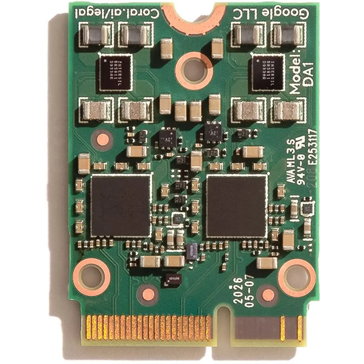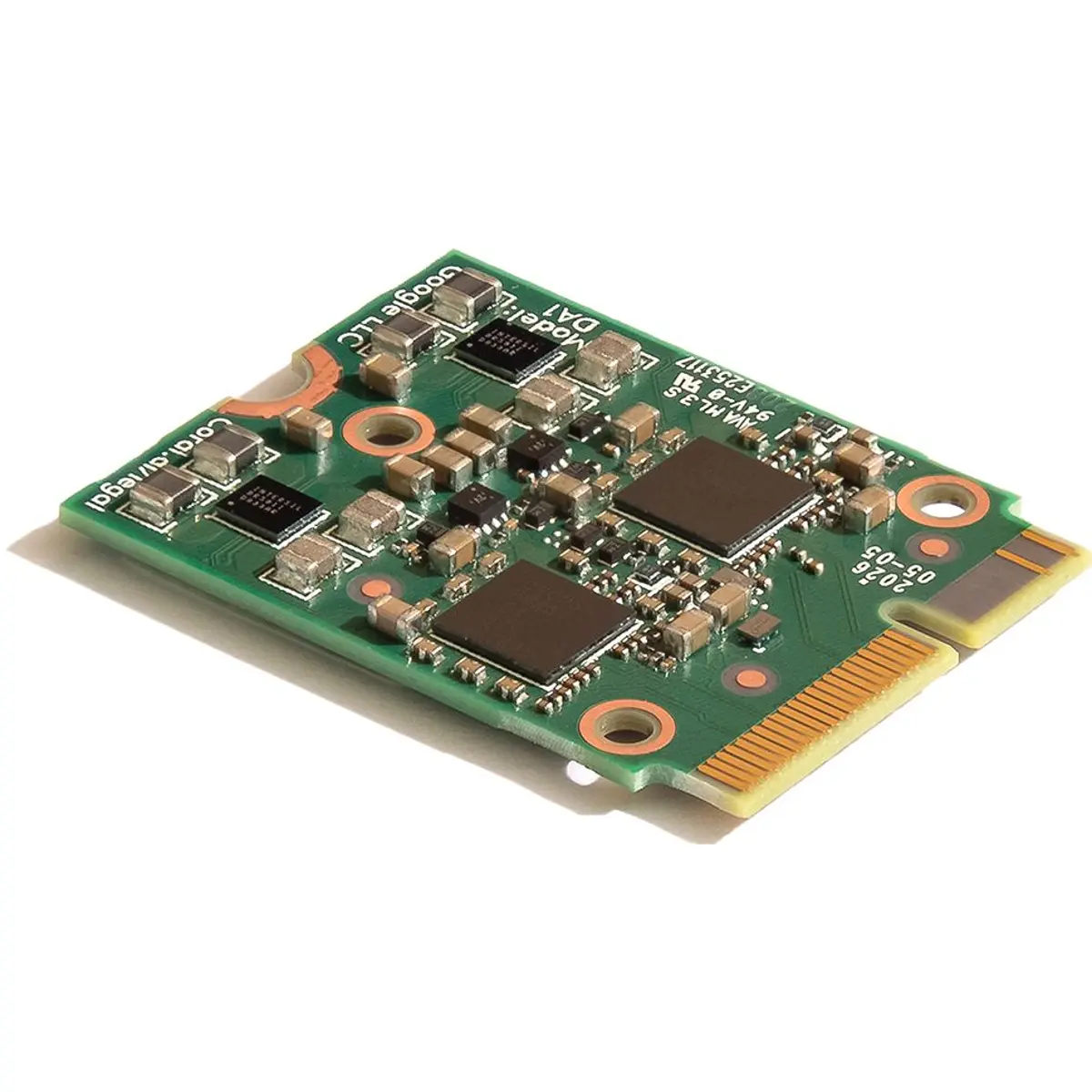 O Coral M.2 Accelerator com Dual Edge TPU é um módulo M.2 (E-key) que inclui dois aceleradores ML Edge TPU, cada um com sua própria interface PCIe Gen2 x1.