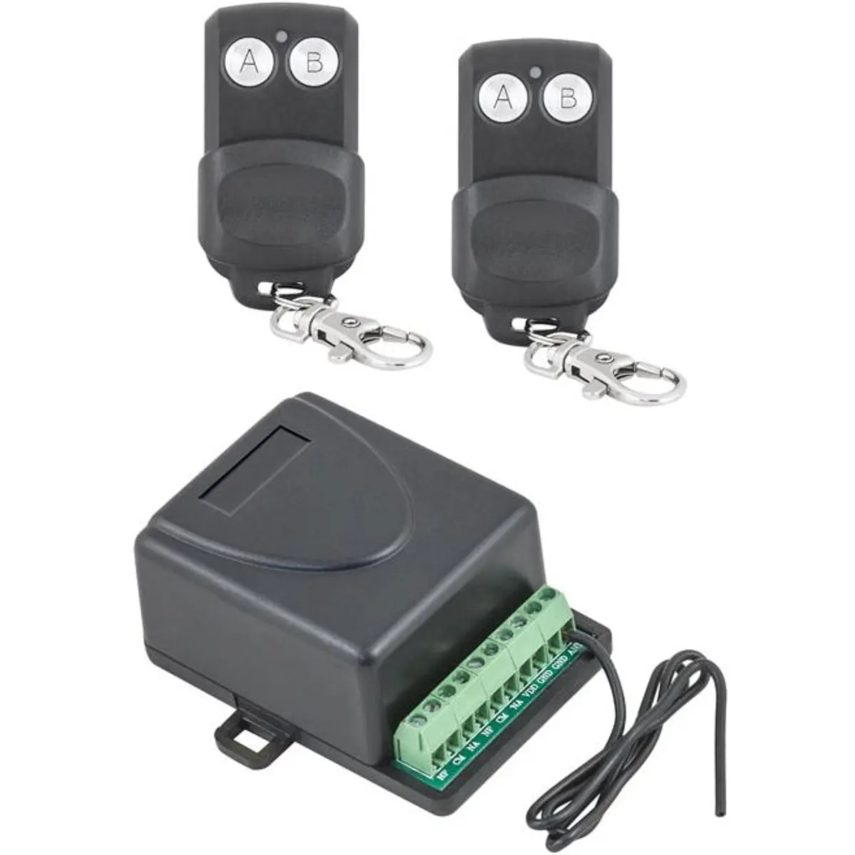 Central receptora de garagem para interior com dois telecomandos universais a 433Mhz, alimentação 12V e bateria incluída de 12V 27A. Dimensões 12,6 x 22 x 3,3 cm.
