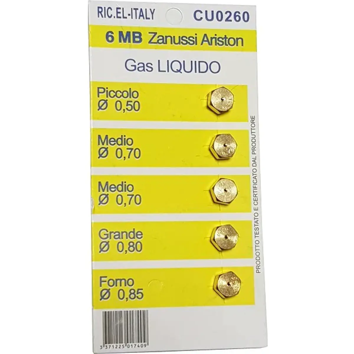 Conjunto de injetores M6 para gás butano, destinado a fogões. Inclui cinco peças: Ø0.5mm (pequeno), Ø0.7mm (médio) 2x, Ø0.8mm (grande) e Ø0.85mm (forno). Ideal para ajustar a chama de queimadores e forno em fogões a gás, oferecendo opções de diâmetro para diferentes necessidades de combustão.