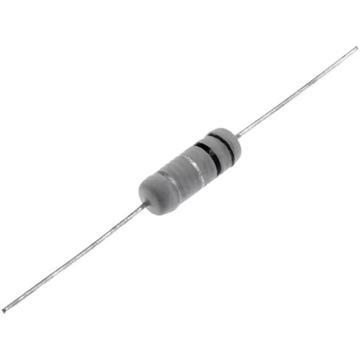 Resistência bobinada axial de potência, 0,1 Ω, 5 W, com montagem THT e terminais axiais. Possui coeficiente de temperatura de 400 ppm/°C e tolerância de ±5%. Dimensões Ø6,5 x 17,5 mm e pinos Ø0,75 x 28 mm. Resistente a temperaturas elevadas, adequada para circuitos de potência, medição de corrente e regulação em fontes de alimentação.