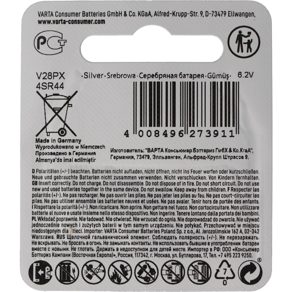 Varta - Pilha de óxido de prata-zinco V28PX / 4SR44 6.2V 145 mAh