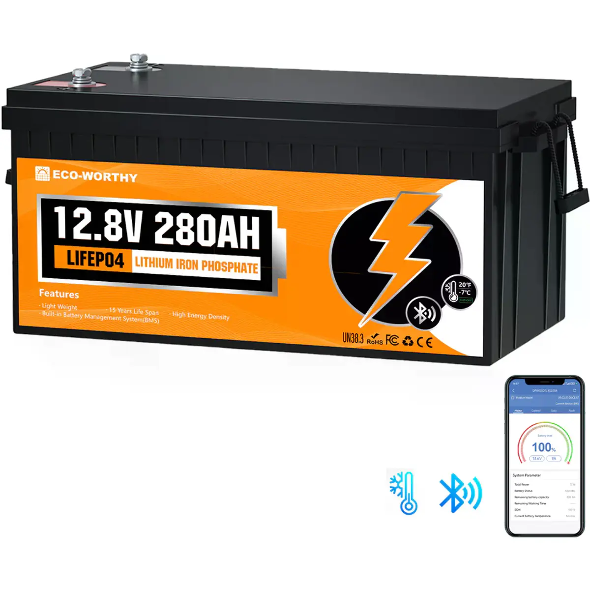 ECO-WORTHY - Bateria de Lithium (LiFePO4) BMS c/ Bluetooth - 12.8V 280A (3584Wh)