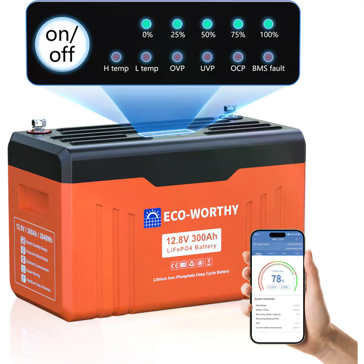 A bateria LiFePO4 de 12V 300Ah da ECO-WORTHY combina elevado desempenho com funcionalidades inteligentes. Com BMS de 200A e proteção contra baixas temperaturas, oferece o dobro da potência, metade do peso e uma durabilidade até 8 vezes superior face às baterias de chumbo-ácido seladas. Ideal para aplicações exigentes como backup doméstico, autocaravanas, sistemas solares e mais.