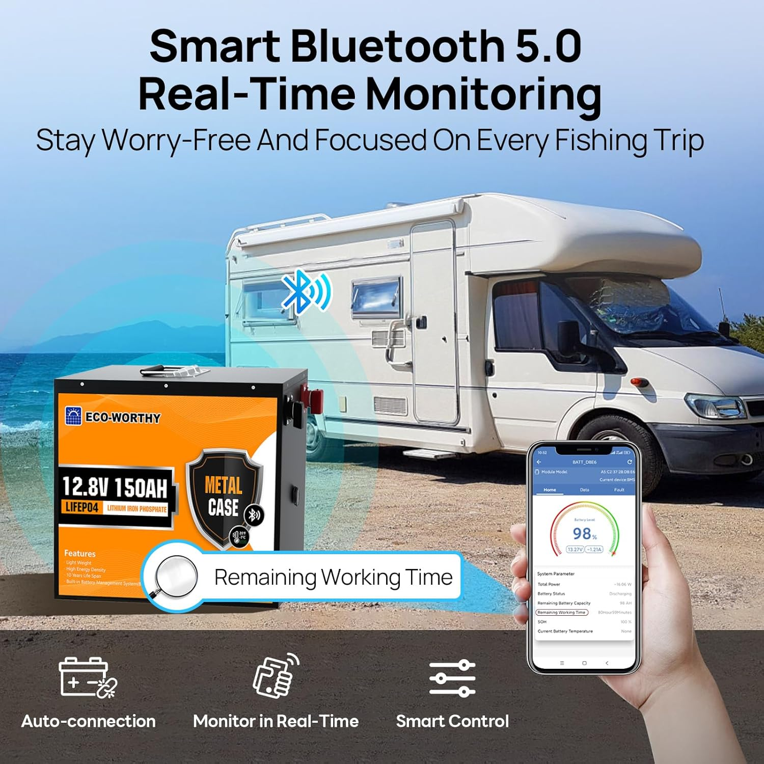 Bateria de lítio ferro-fosfato de alta durabilidade, equipada com caixa metálica resistente ao fogo, impactos e quedas, com excelente dissipação térmica. Inclui BMS de 120A com proteções completas e funções avançadas, além de monitorização Bluetooth 5.0 em tempo real. Concebida para aplicações exigentes como autocaravanas, pesca, sistemas solares, embarcações e equipamentos de bordo.