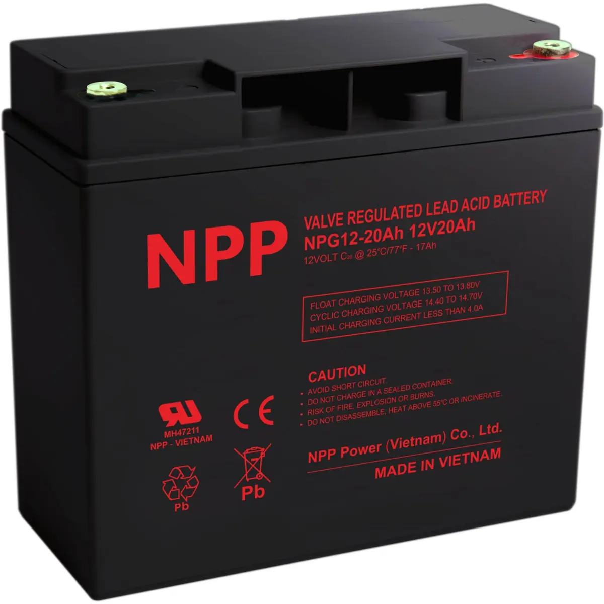 Bateria de chumbo-ácido selada de 12 V, adequada para standby e aplicações cíclicas, com 20 Ah (10 h) a 25 °C, 17,9 Ah (20 h) e 16 Ah (5 h). Possui terminais T12 (M5), construção robusta resistente a vibrações e peso de 5,8 kg, com dimensões de 181 × 77 × 155 mm. Flutuação 13,5–13,8 V; carga 14,5–14,7 V em ciclo. Suporta até 4 A de carga e picos de descarga de 300 A. Vida útil: 12 anos (JIS 25 °C) ou 10–12 anos (Eurobat 20 °C). Ideal para UPS, telecomunicações, segurança e indústria.