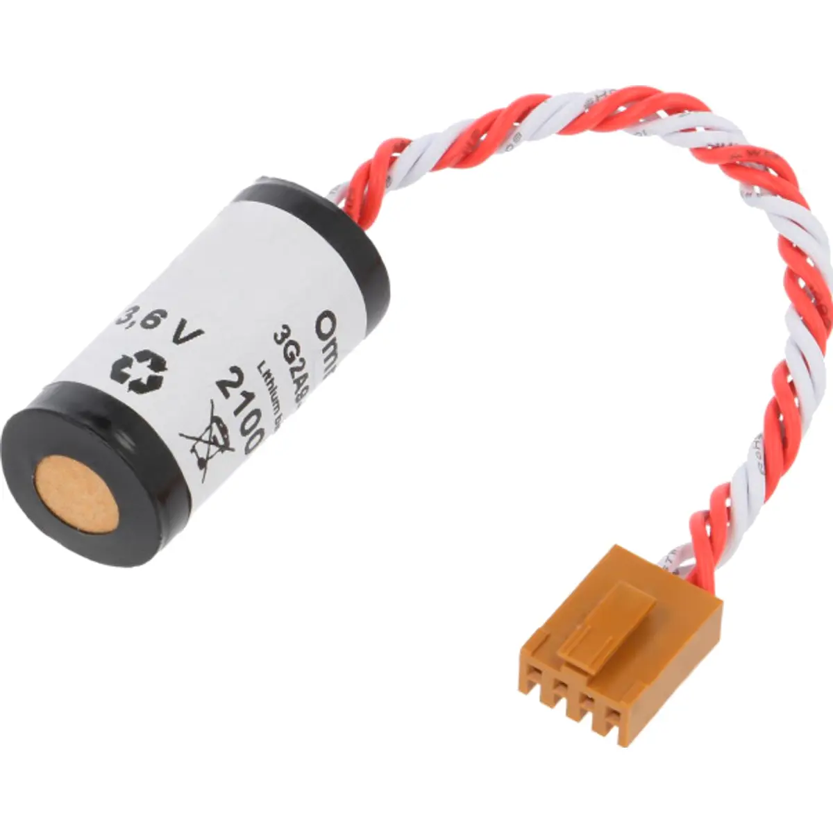Pilha de lítio não recarregável de 3,6 V para PLCs Omron, com capacidade de 2100 mAh, formato 2/3A (17330), com ficha e quatro fios. Mede Ø16.5x35.4 mm e opera entre -60 a 85°C, com corrente máxima de 25 mA. Compatível com modelos Omron como C1000H, C120, C20, C500, CV1000, GT600, entre outros, oferecendo solução de backup de energia para automação industrial.