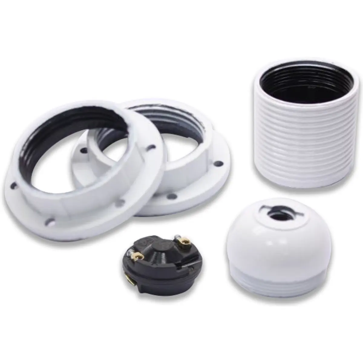 Suporte para lâmpada E27 roscada, branco, com rosca de 40 mm e comprimento de 38 mm. Conjunto inclui miolo E27 e 2 anilhas brancas, totalizando 54 mm de comprimento e diâmetro da porca de 58 mm. Compatível com lâmpadas E27 padrão, oferece montagem simples e acabamento neutro, com variações de cor ligeiras. Nota: as cores podem variar ligeiramente. Ideal para iluminação doméstica discreta.
